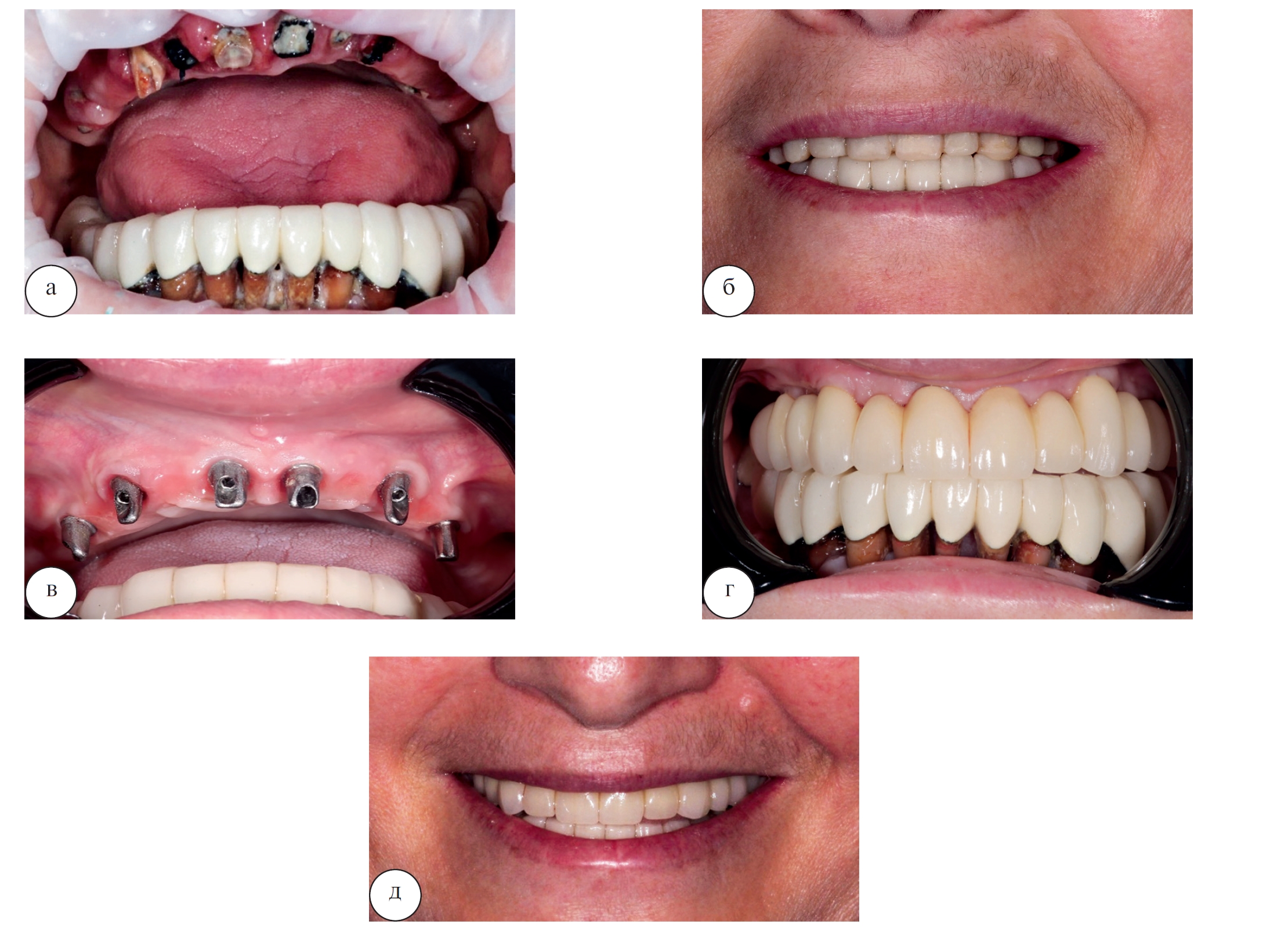 Рис. 7. Восстановление зубного ряда верхней челюсти с помощью несъемной ортопедической конструкции пациентки М. 63 лет: а – исходная клиническая картина в полости рта; б – временная ортопедическая конструкция, изготовленная методом «силиконового ключа» в день операции; в – клиническая картина в полости рта после фиксации постоянных абатментов; г – внешний вид окончательной конструкции из металлокерамики в полости рта; д – улыбка пациентки после завершения стоматологической реабилитации