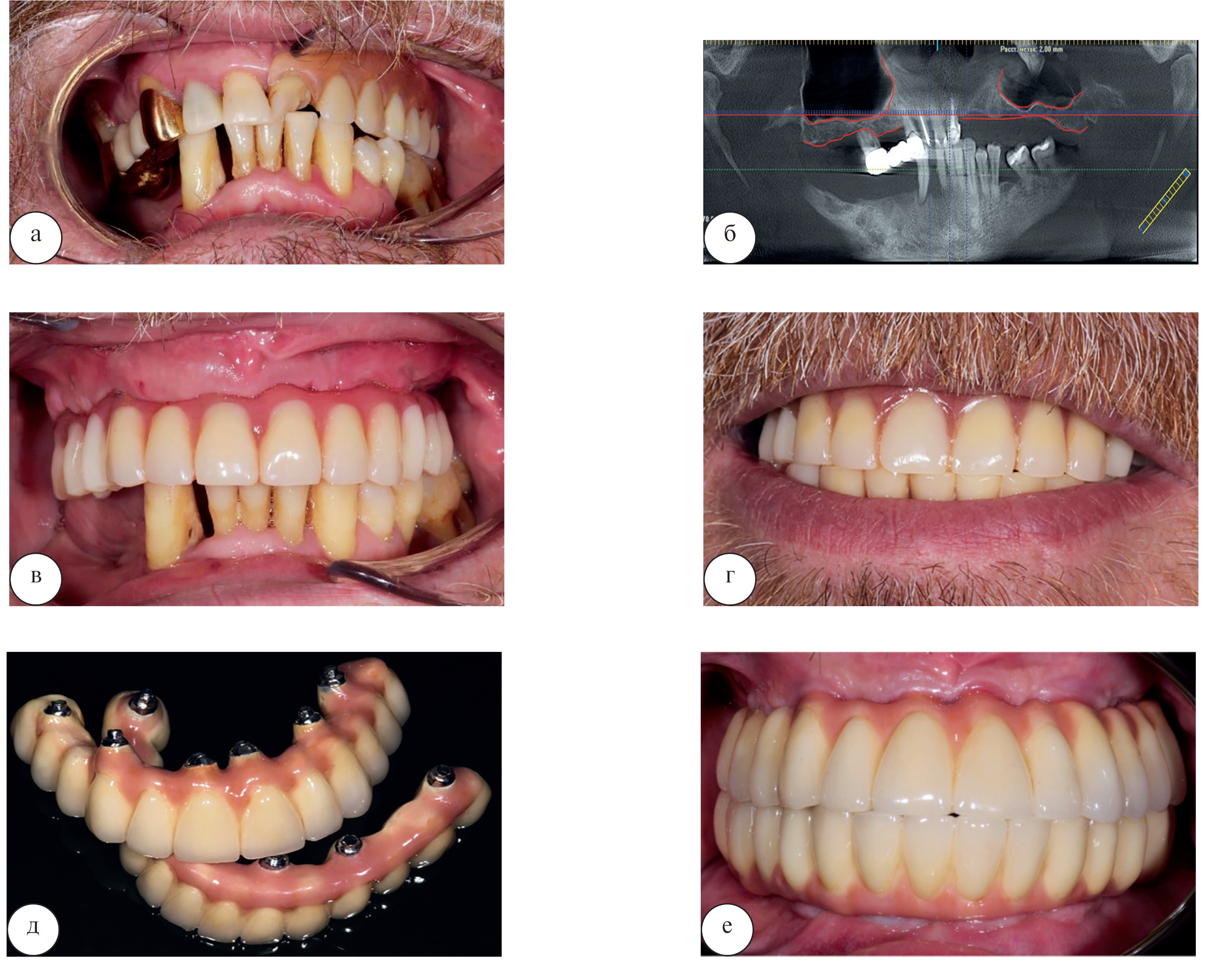 Рис. 8. Этапы стоматологической реабилитации с использованием дентальных имплантатов и проведением костной пластики на верхней челюсти и дентальной имплантации без костной пластики на нижней челюсти пациента Г. 69 лет: а – исходная клиническая картина в полости рта; б – срез компьютерной томограммы до начала лечения; в – установка временного условно-съемного акрилового протеза на верхней челюсти; г – улыбка пациента с временными акриловыми протезами на верхней и нижней челюсти; д – условно-съемные металлокерамические протезы обеих челюстей на винтовой фиксации; е – фиксация реставраций в полости рта, завершение стоматологической реабилитации