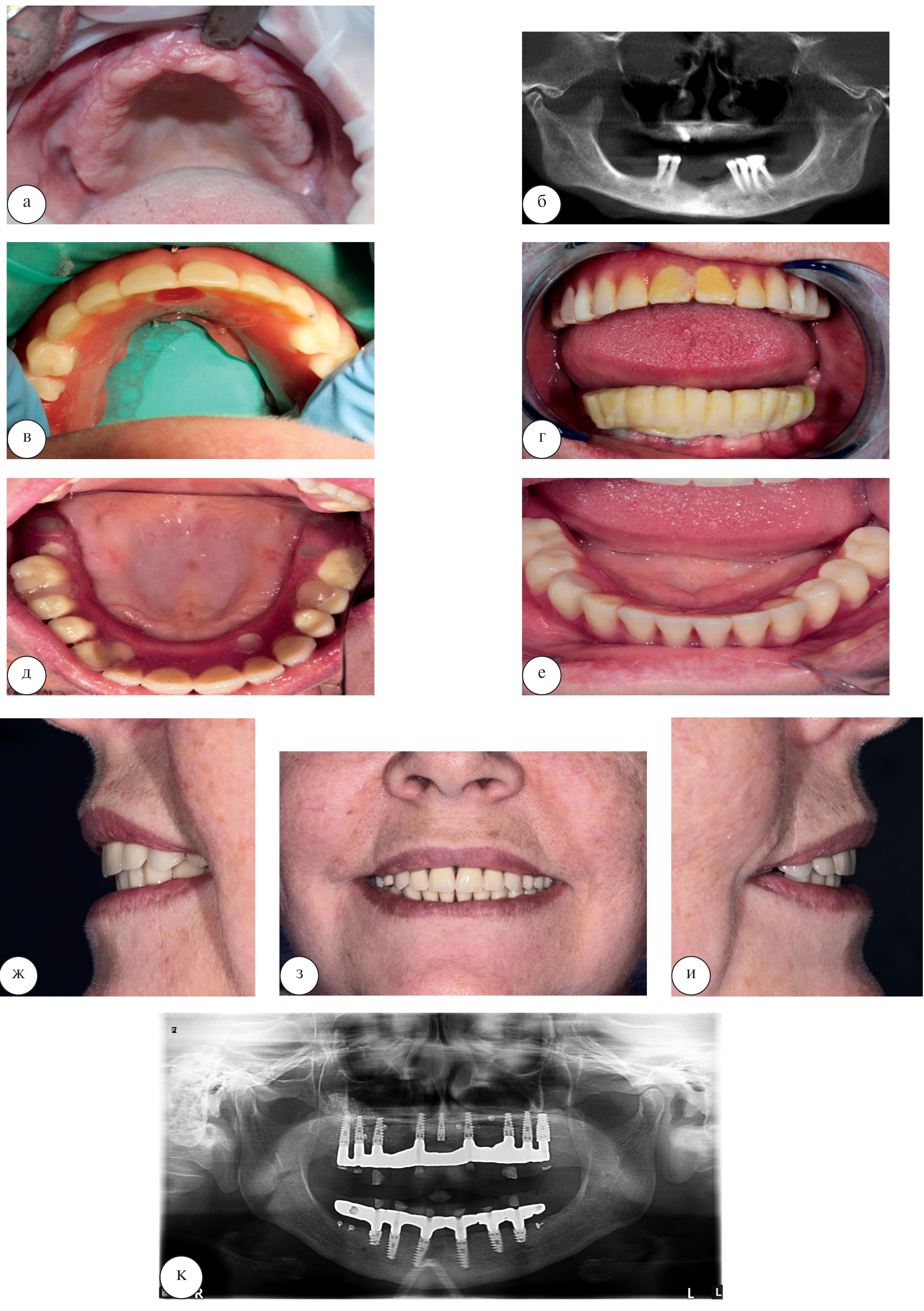 Рис. 11. Последовательность стоматологической реабилитации пациентки М. 68 лет от начала лечения до установки окончательной ортопедической конструкции: а – исходная клиническая картина в полости рта; б – срез компьютерной томограммы до начала лечения; в – перебазировка съемного протеза в полости рта, перевод его в условно-съемный; г – временные ортопедические конструкции на верхней и нижней челюсти; д, е – этап фиксации постоянных условно-съемных акриловых протезов на балке; ж, з, и – окончательный результат лечения; к – срез к контрольной компьютерной томограммы через 2 года после завершения лечения