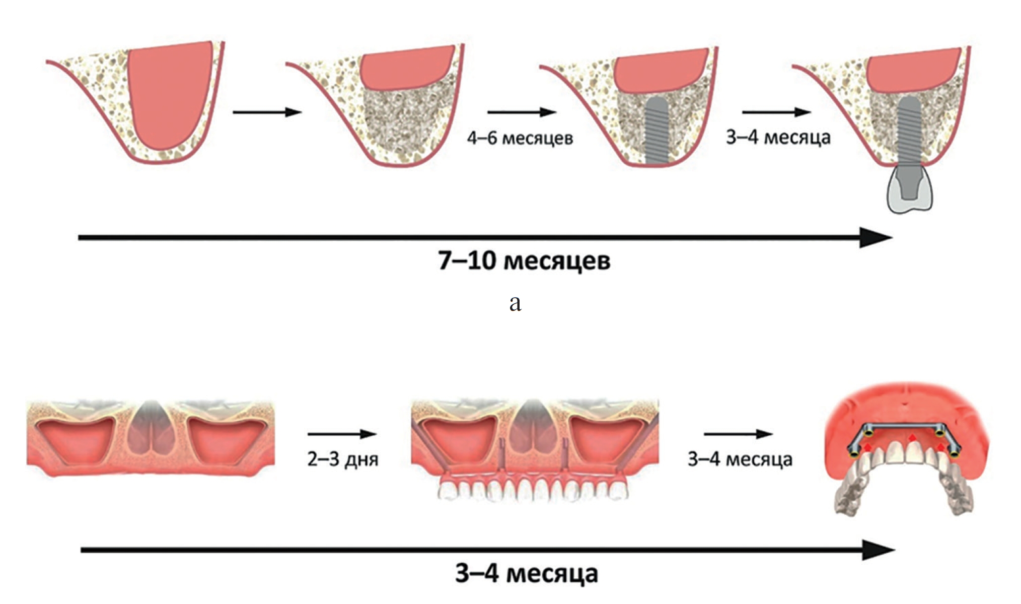 Рис. 12. Временные интервалы установки окончательной ортопедической конструкции при проведении этапной костной пластики (а) и при стоматологической реабилитации с использованием скуловых имплантатов (б)