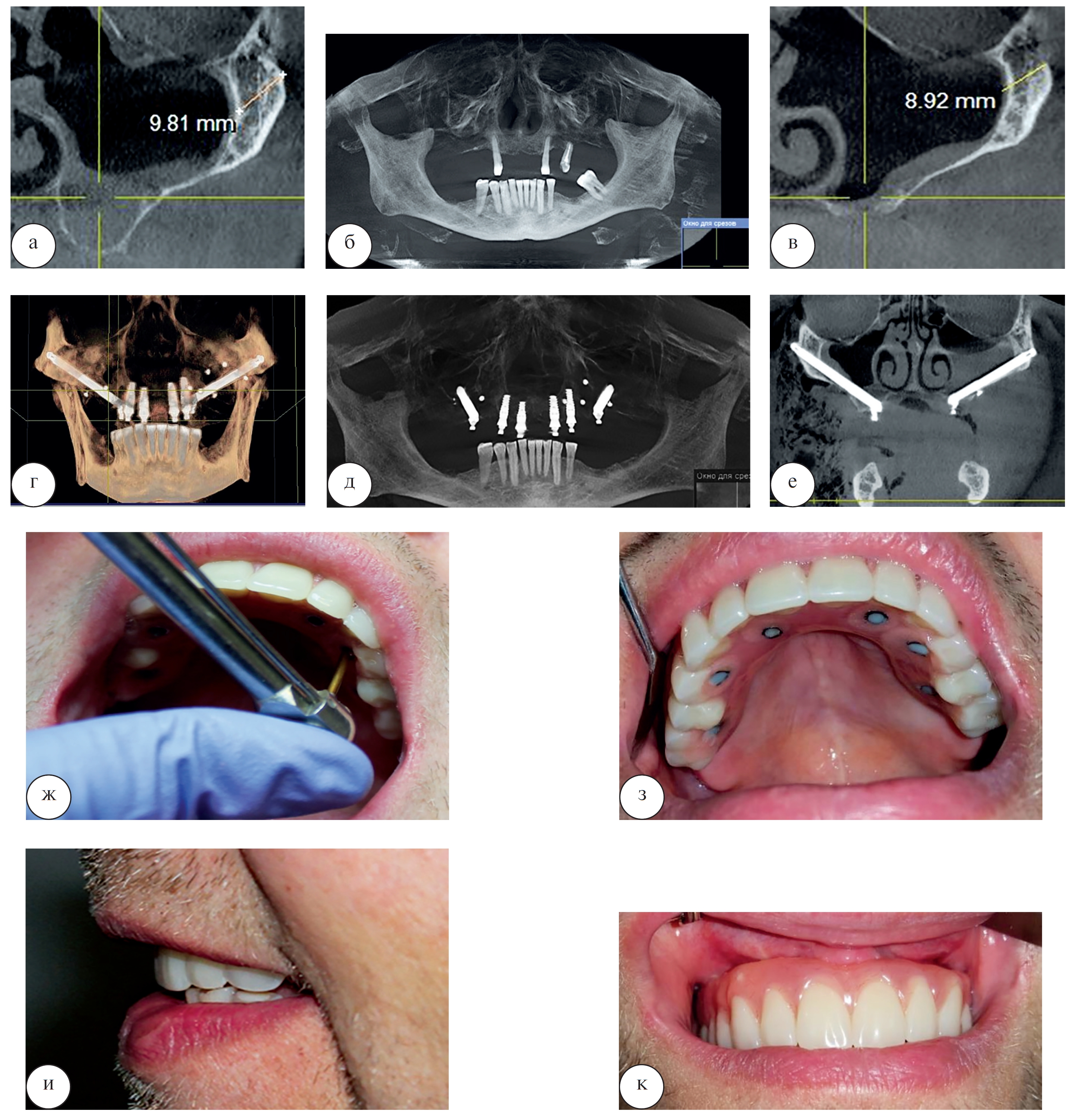 Рис. 13. Стоматологическая реабилитация пациента Х. 58 лет с использованием скуловых имплантатов: а, б, в – срезы компьютерной томограммы до начала лечения; г, д, е – срезы компьютерной томограммы после лечения; ж – фиксация условно-съемного протеза в полости рта через 24 часа после операции; з – вид ортопедической конструкции в полости рта; и, к – контрольный осмотр через 2 года после завершения лечения