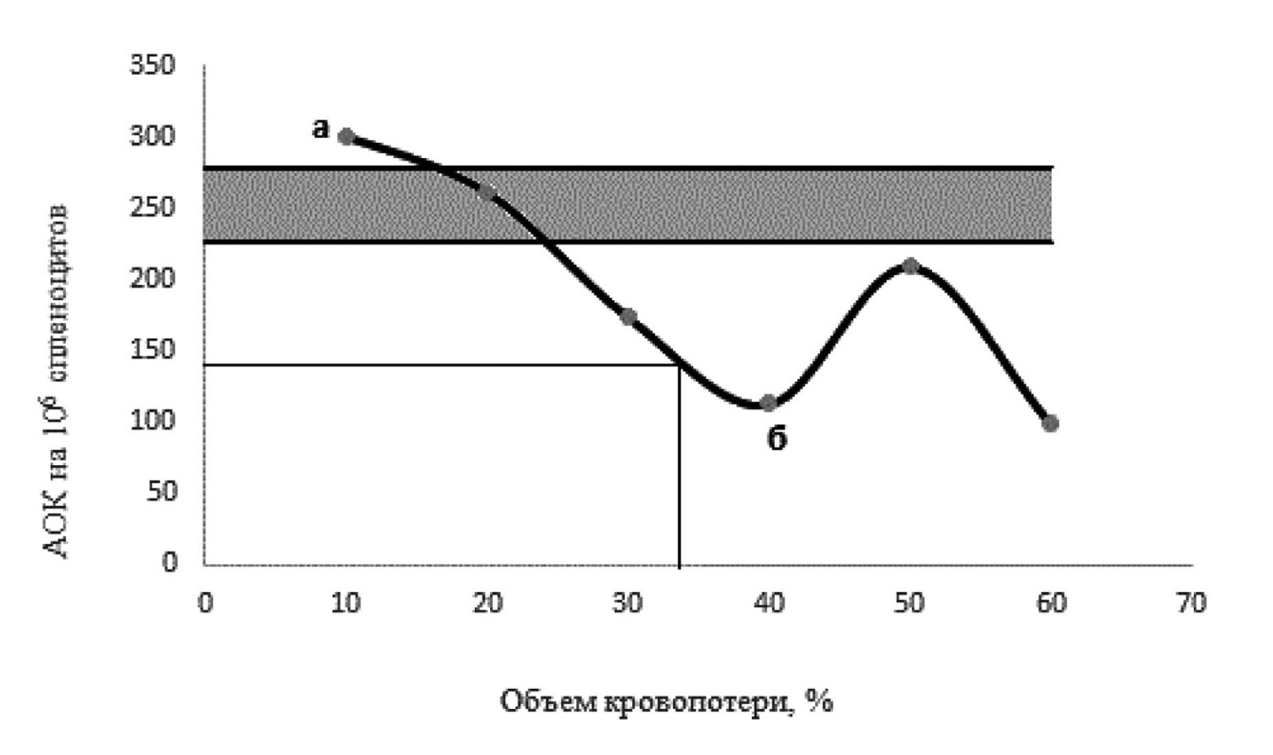 На втором этапе, определив объем кровопотери при травме, сопровождающейся стойкой супрессией гуморального иммунного ответа на ЭБ, по калибровочной кривой (см. рис. 1) определяли соответствующий кровопотере уровень иммунного ответа (точка а и б).