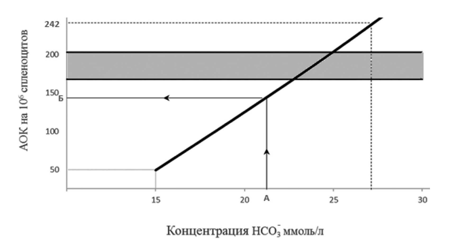 где А – число АОК на 106 спленоцитов; СНСО3– -концентрация ионов НСО3 ммоль/л (в пределах 15–30 ммоль/л использовалась для составления калибровочной кривой).