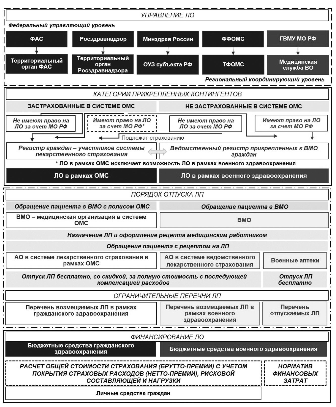 Корректировку управления ЛО определяют Минздрав России, Федеральный фонд ОМС (ФФОМС), Росздравнадзор, Федеральная антимонопольная служба (ФАС), МО РФ в лице ГВМУ МО РФ. На федеральном уровне формируется нормативная правовая база и регламентируется ЛО граждан; обеспечивается межведомственное взаимодействие по ЛО; осуществляется стандартизация МП и ЛО; планируются мероприятия по информатизации здравоохранения; вырабатываются механизмы ценообразования на ЛП, а также механизмы внедрения и финансового сопровождения лекарственного страхования.