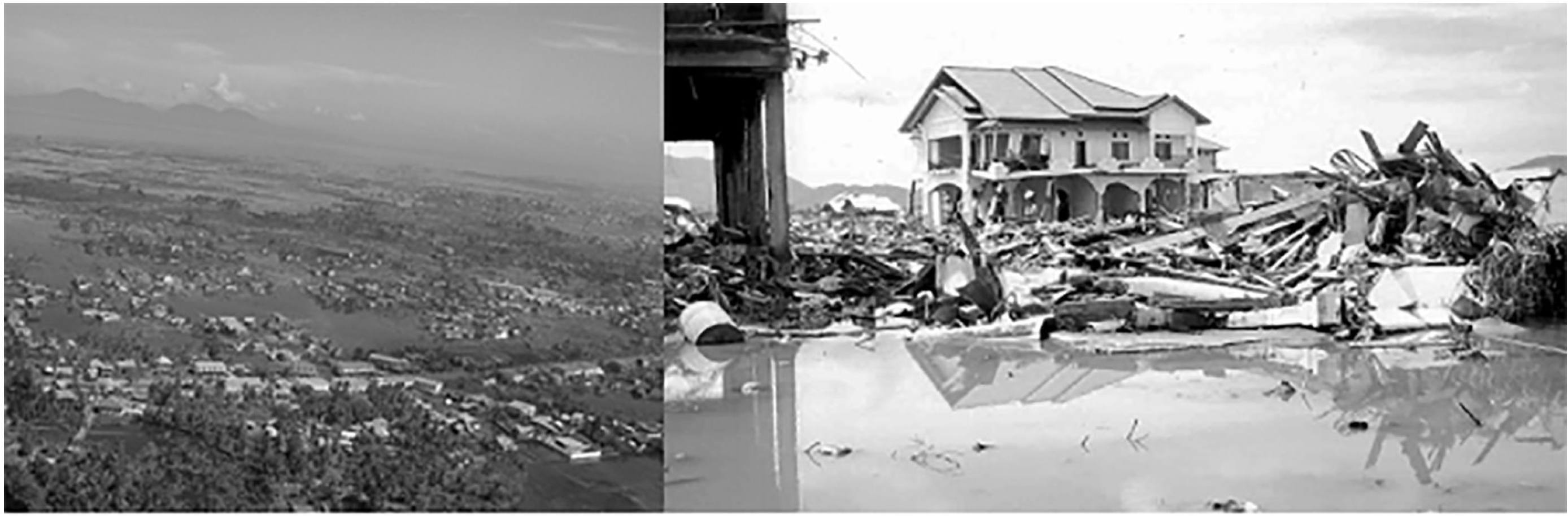 Результаты и их обсуждение. Индонезия – островное государство, расположенное в сейсмоопасной зоне. Последнее наиболее масштабное землетрясение произошло 26 декабря 2004 г. Его эпицентр располагался на глубине около 20 км под дном океана примерно в 200 км к западу от северной оконечности индонезийского острова Суматра. Землетрясение вызвало волну цунами, достигавшую 30 м, которая практически сразу же обрушилась на побережье Суматры. Общая площадь поражения составила около 10 тыс. км2, полоса вдоль северной и центральной части западного побережья о. Суматра шириной до 10 км представляла собой зону сплошного разрушения. Общее количество погибших превысило 280 тысяч человек [2, 7, 8]. В наибольшей степени пострадали города Банда Аче (погибло около 50% из 250 тыс. жителей), Мелабу (в живых осталось 500 человек из 50 тыс. жителей), Чаланг [2, 8]. Сотни тысяч индонезийцев потеряли жилища, большинство населенных пунктов, коммуникаций, учреждений инфраструктуры были полностью разрушены (рис. 1–3).