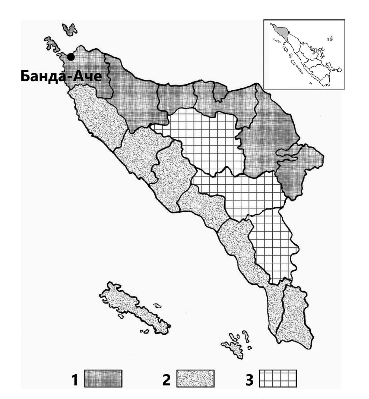 На территории Индонезии широко распространены комары 16 различных видов рода Anopheles – переносчики трансмиссивных тропических инфекций. Среди переносчиков малярийных паразитов на территории о. Суматра наибольшее эпидемическое значение имеют комары An. sundaicus [11]. Их массовый выплод происходит в конце сезона дождей. В 2005 г. это явление наблюдалось на 1,5–2 месяца раньше обычного – в конце января – начале февраля, что, по-видимому, связано с произошедшими природными катаклизмами. Местами выплода комаров этого вида служат заболоченные участки, рисовые чеки, сточные канавы и лужи, образующиеся во время сезона тропических дождей. Днем насекомые укрываются внутри жилых и подсобных помещений, а также в близлежащих зарослях травы и кустарника. Наибольшая активность самок наблюдается в сумеречное время суток, а также в течение всей ночи. Интенсивность нападения комаров на человека во многом зависит от скорости движения воздуха и его влажности. Природно-климатические условия в зоне действия РВМГ способствовали постоянной активности переносчиков. Активность нападения самок комаров при определении способом «сбора на себе» в сумеречные часы составляла 10–12 посадок за 1 ч., в ночное время – 6–8 посадок за 1 ч. На основании результатов анализа природных, климатических и социальных факторов на территории острова Суматра нами было выделено 3 климатогеографических региона, отличающихся между собой условиями распространения малярийной инфекции (рис. 6).