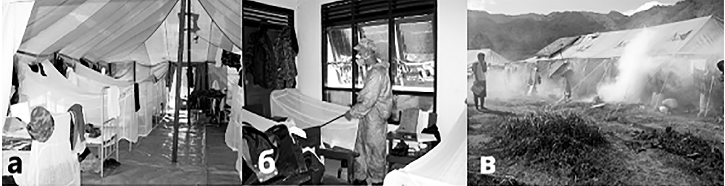 Рис. 7. Применение средств защиты от нападения переносчиков: а – использование надкроватных противомоскитных сеток в помещениях для отдыха личного состава; б – инсектицидная обработка помещений для отдыха офицерского состава РВМГ с помощью пневматического аэрозольного опрыскивателя; в – инсектицидная обработка мест временного проживания беженцев с помощью термомеханического генератора горячего тумана