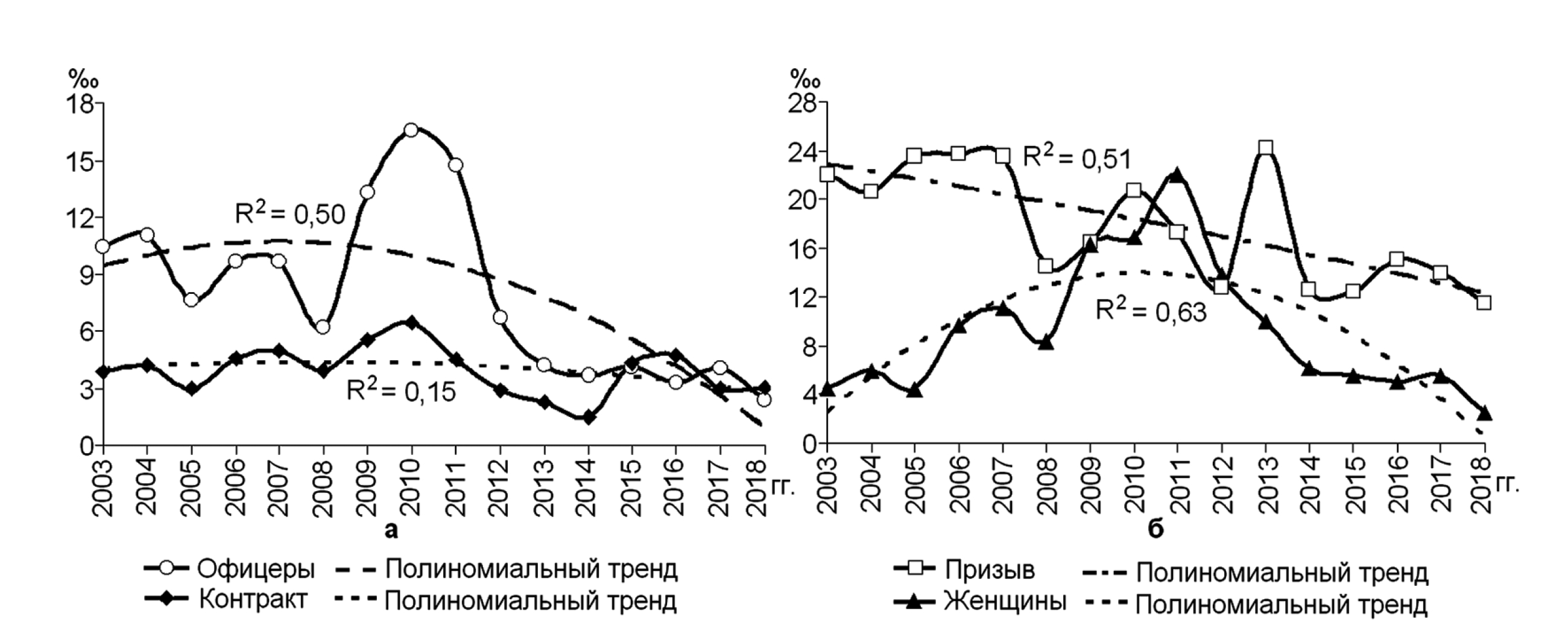 Заключение. Среднегодовой уровень увольняемости офицеров в 2003–2018 гг. составил 7,98±1,10‰, военнослужащих по контракту – 3,92±0,32‰, военнослужащих по призыву – 17,57±1,19‰, военнослужащих-женщин – 9,14±1,37‰. Полиномиальные кривые увольняемости всех категорий военнослужащих в 2003–2018 гг. демонстрировали тенденции уменьшения показателей. Значительный подъем уровня увольняемости офицеров в 2009–2011 гг. можно объяснить последействием непопулярного организационно-штатного реформирования ВС России, повышением профессиональной нагрузки вследствие сокращения количества офицеров и, возможно, установками получения выгоды у некоторых офицеров.