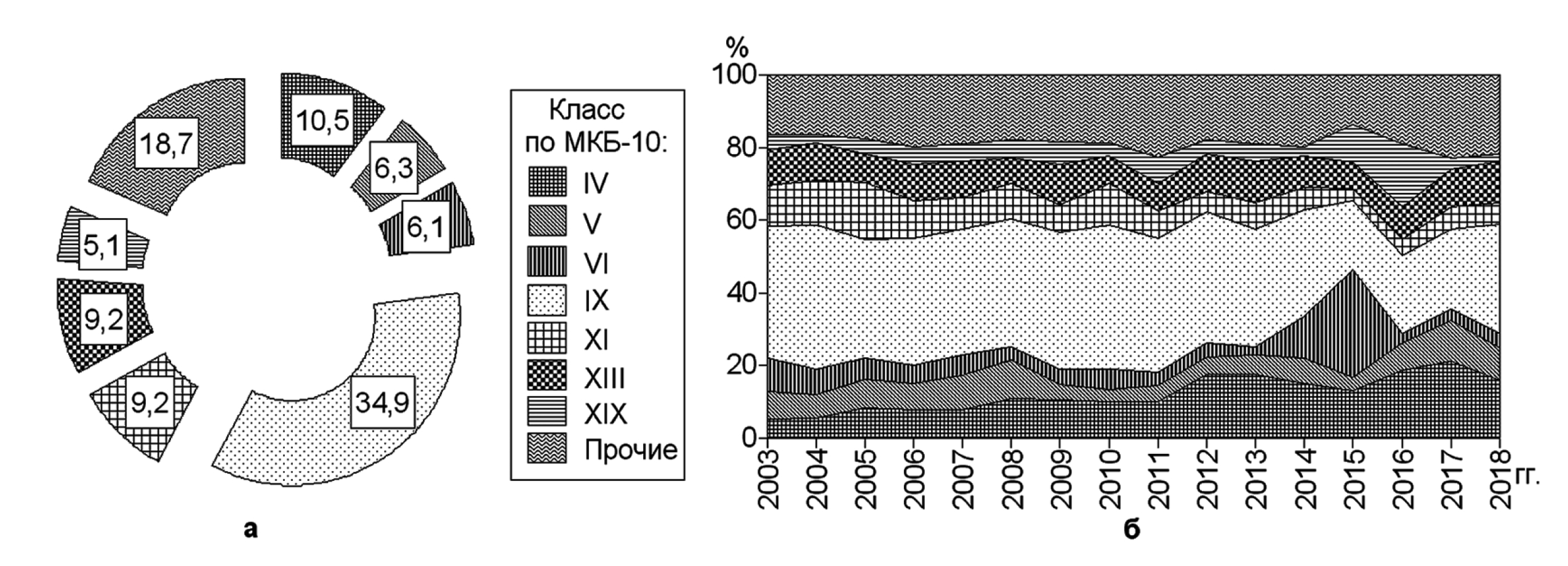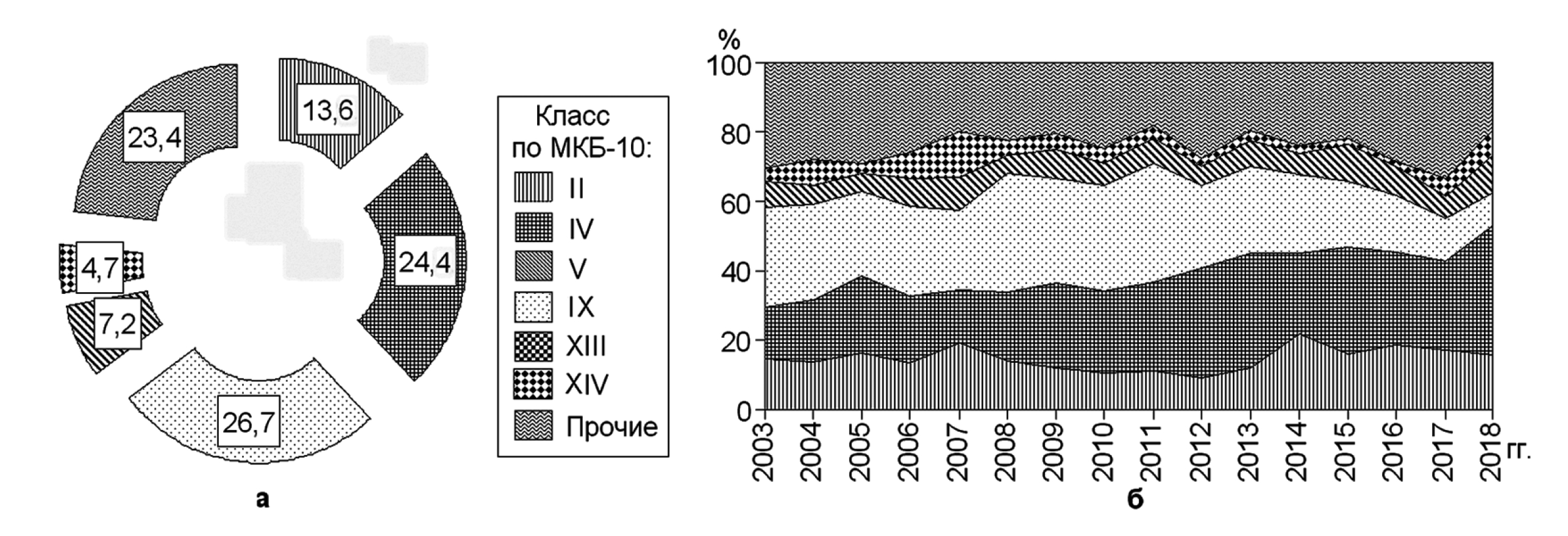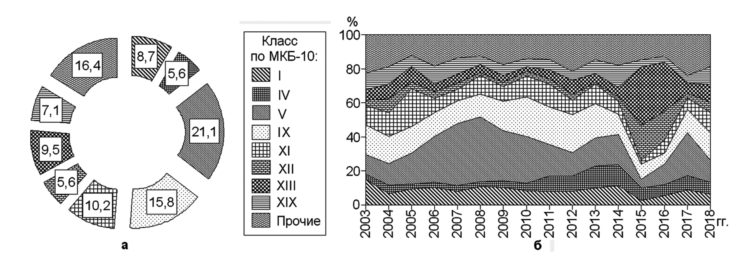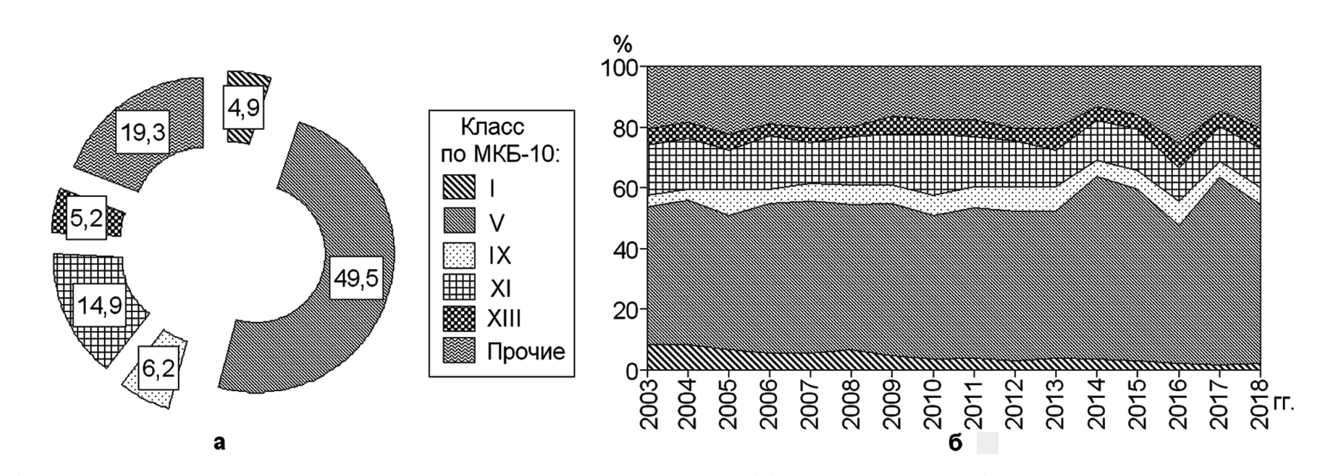 Рис. 2. Структура увольняемости офицеров (а) и её динамика (б) по болезням ведущих классов