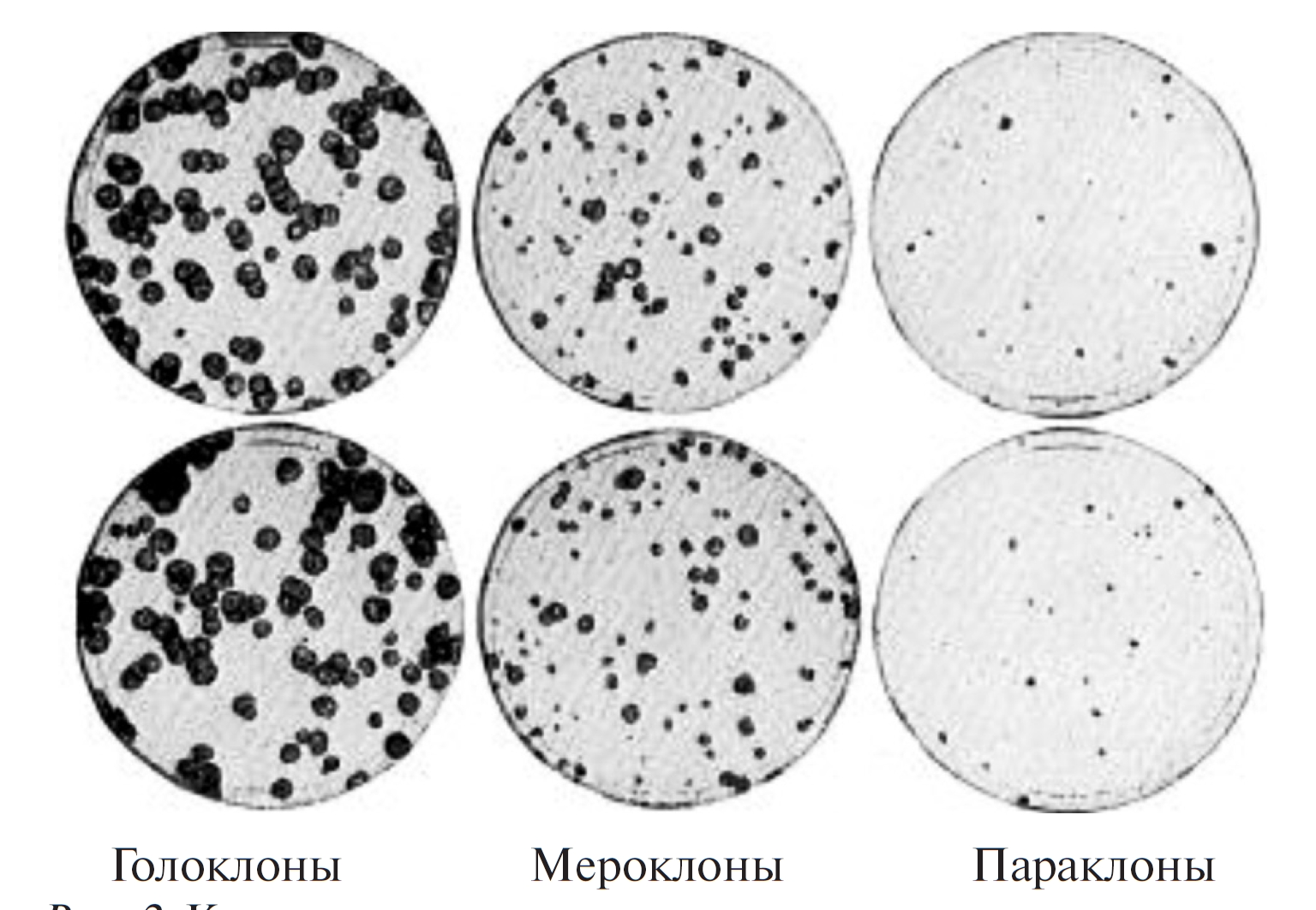 Считается, что СК являются те клетки, которые быстро растут и образуют большое количество клонов in vitro. Это понятие пришло из ранних исследований эпидермальных СК, где доля таких клеток (голоклонов) коррелирует с долей СК в базальном слое (рис. 2). Клоны были классифицированы как голоклоны (большие), мероклоны (средние) и параклоны (малые). Голоклоны считались дифференцированными из СК.