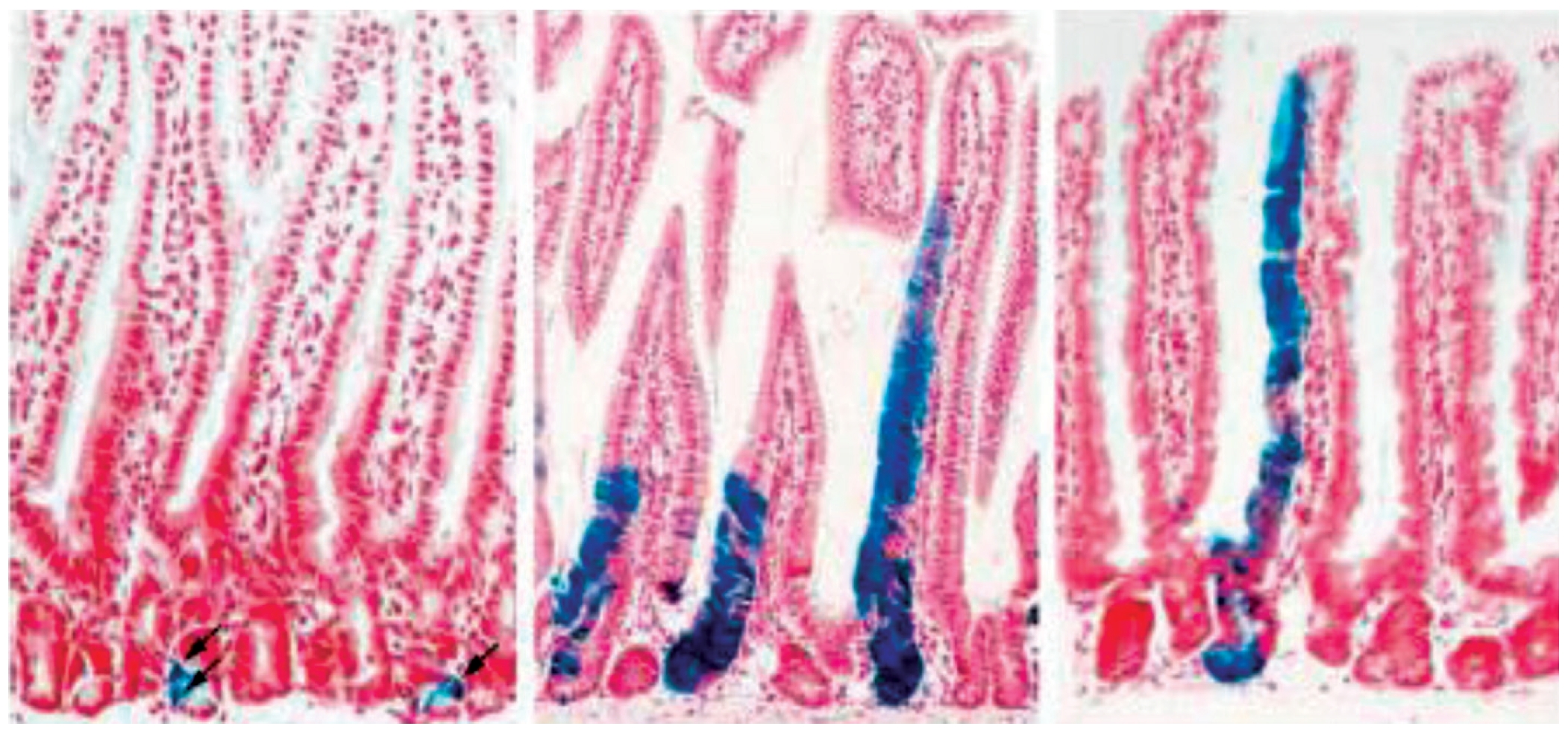 Рис. 3. Потомки СК в тонком кишечнике мышей, обнаруженные с помощью технологии CRISPRCas9; СК экспрессируют белок LGR5, использованный для маркировки: а – мыши, помеченные за 1 день до гистологического исследования; б – за 5 дней до гистологического исследования; в – за 60 дней до гистологического исследования (N. Barker et al., 2007)