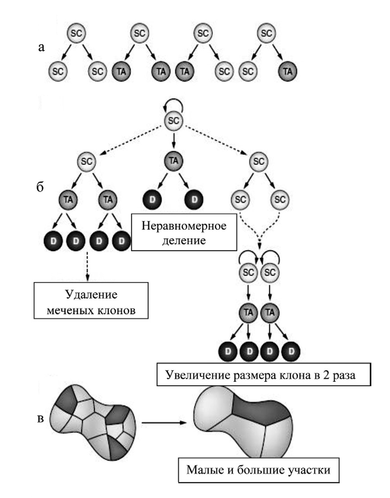 Рис. 4. Стохастическая модель стволовых клеток: а – 4 типа деления стволовых клеток; б – удаление меченых клонов и увеличение размера клеток меченого клона; в – тенденция меченых клонов уменьшить размеры и их увеличение со временем. SC – стволовые клетки, ТА – клетка, усиливающая транзит, D – дифференцированная клетка