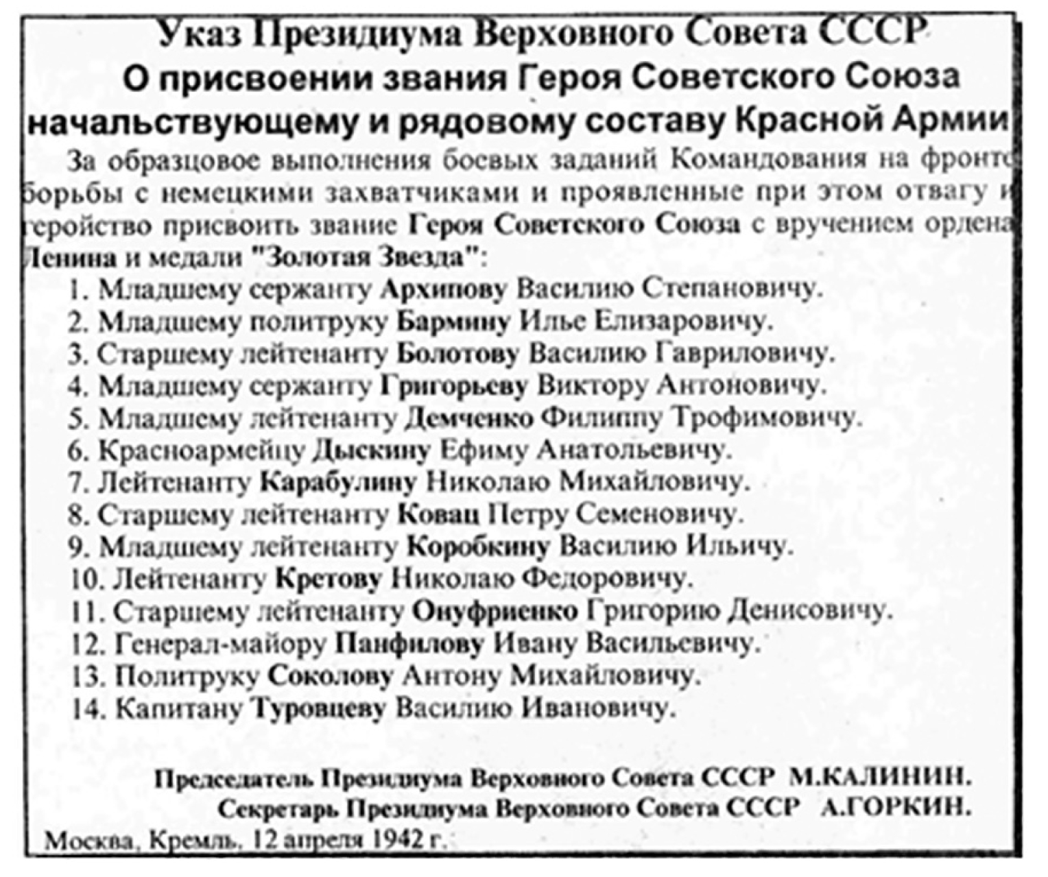 В нём среди награжденных был генерал – Панфилов Иван Васильевич и красноармеец – Дыскин Ефим Анатольевич. Обоим это звание было присвоено посмертно [6].