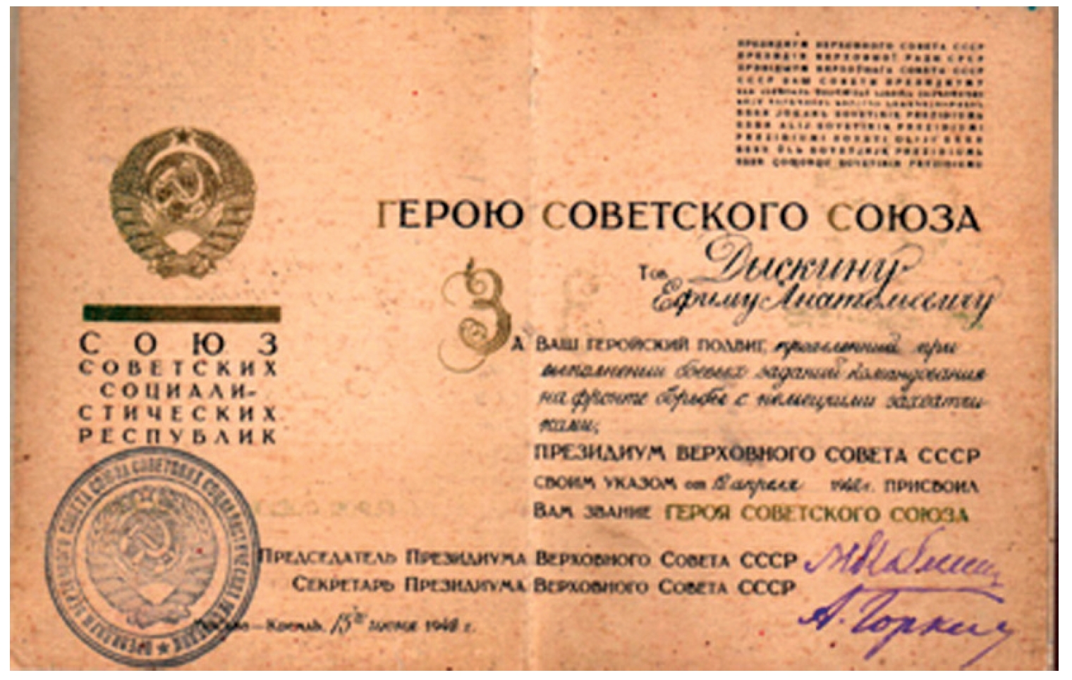 Спустя два месяца, в июне 1942 г., в Свердловске в театре оперы и балета председатель комитета по делам высшей школы при Совете Министров СССР С.В.Кафтанов в торжественной обстановке вручил Дыскину Ефиму Анатольевичу удостоверение Героя Советского Союза, орден Ленина и медаль «Золотая Звезда» (рис. 5) [6, 12].
