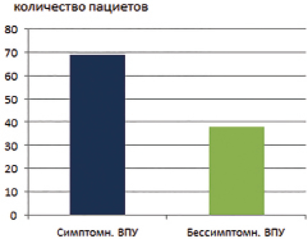 Рис. 1. Симптомное и бессимптомное течение синдрома ВПУ у молодых мужчин – жителей Санкт-Петербурга