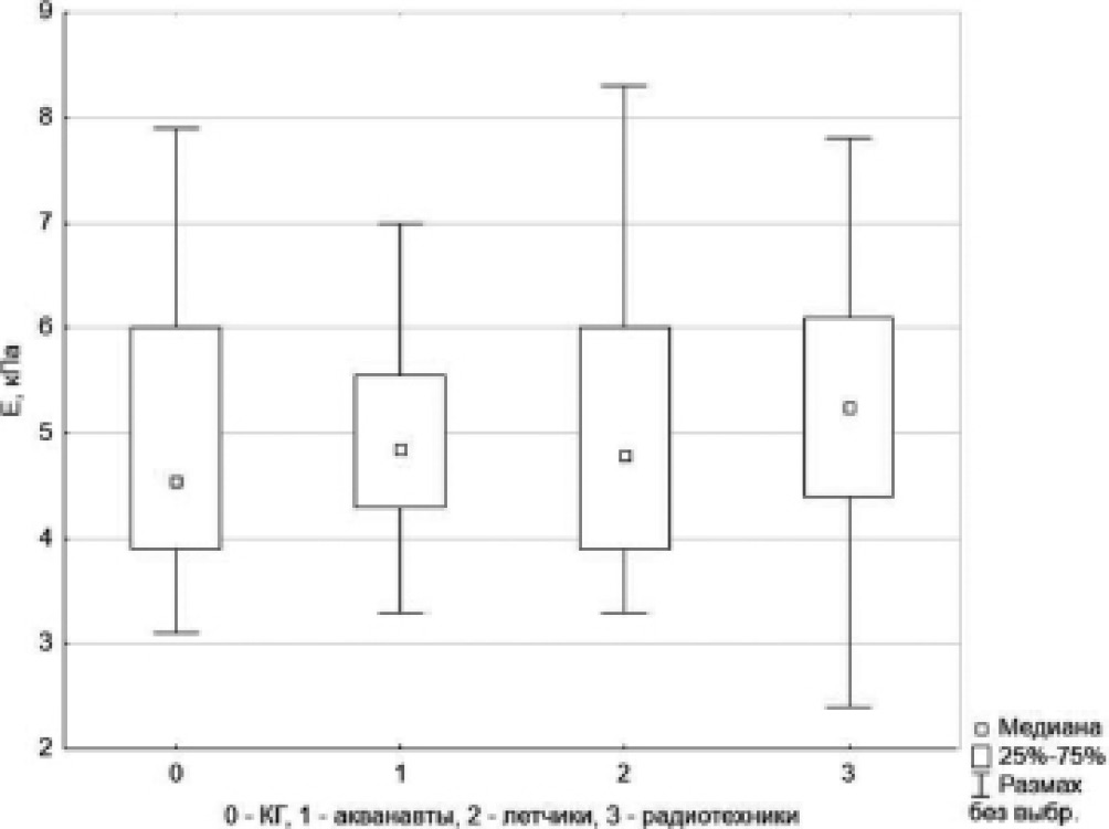 Модуль упругости (Е), отражающий степень эластичность и степень фиброза печени, в группе акванавтов (4,85 (4,3; 5,5) кПа), летчиков (4,8 (3,9; 6 ) кПа) и радиотехников (5,45 (3,9; 6,5) кПа) не отличался от значения КГ (4,55 (3,9; 6) кПа), рисунок 1.