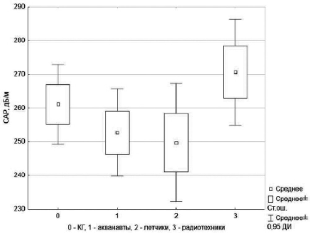 Степень стеатоза печени, выражавшаяся в изменениях КПЗУ, у радиотехников (271±45,8 дБ/м) достоверно (p<0,05) превышала значения КГ (261±37,1 дБ/м), групп летчиков (249±56,9 дБ/м) и акванавтов (252±42,6 дБ/м), рисунок 2.