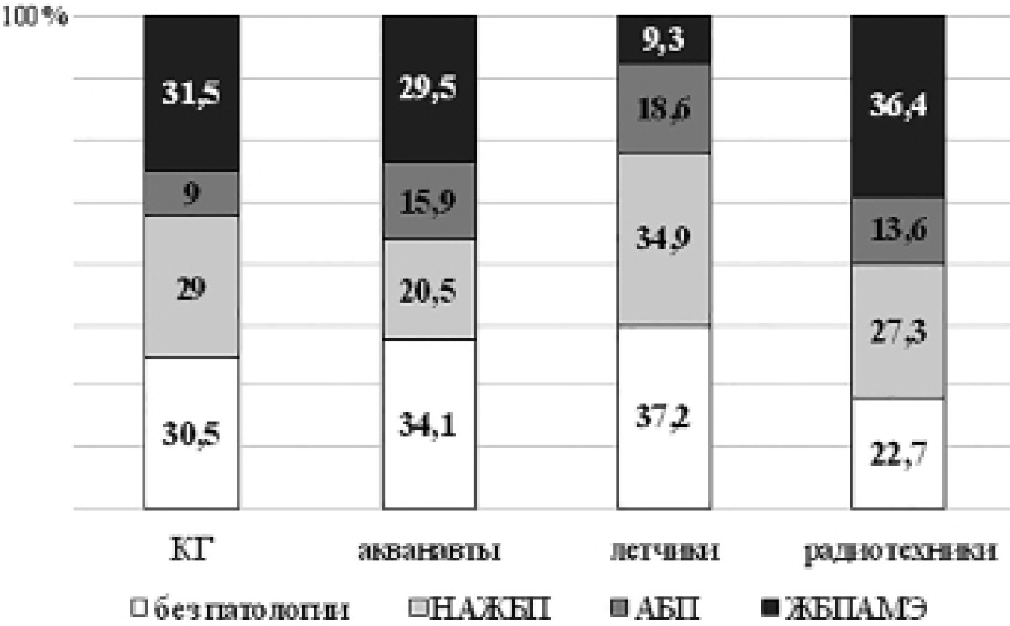 В качестве доминирующей невирусной патологии печени в КГ выступали НАЖБП (29%) и жировая болезнь печени алкогольно-метаболической этиологии (ЖБПАМЭ) (31,5%), в группе акванавтов – ЖБПАМЭ (29,5%), летчиков – НАЖБП (34,9%), радиотехников – ЖБПАМЭ (36,4%) и НАЖБП (27,3%). НАЖБП чаще всего выявляли в группах летчиков (34,9%, p>0,05) и КГ (29%), АБП – в группе летчиков (у 18,6%), реже – в группе контроля (9%), p<0,05. ЖБПАМЭ встречалась приблизительно с одинаковой частотой у трети обследованных в группах контроля (3,5%), акванавтов (29,5%) и радиотехников (36,4%), а также в 9,3% случаев (p<0,05) у летчиков.
