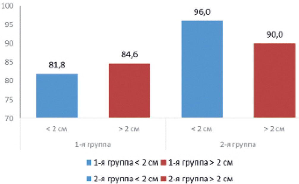 Перкутанная хирургия у военнослужащих с камнями размером более 2 см была эффективна у 22 (84,6%) пациентов 1-й группы и у 9 (90%) больных 2-й группы и не имела статистически достоверных отличий.
