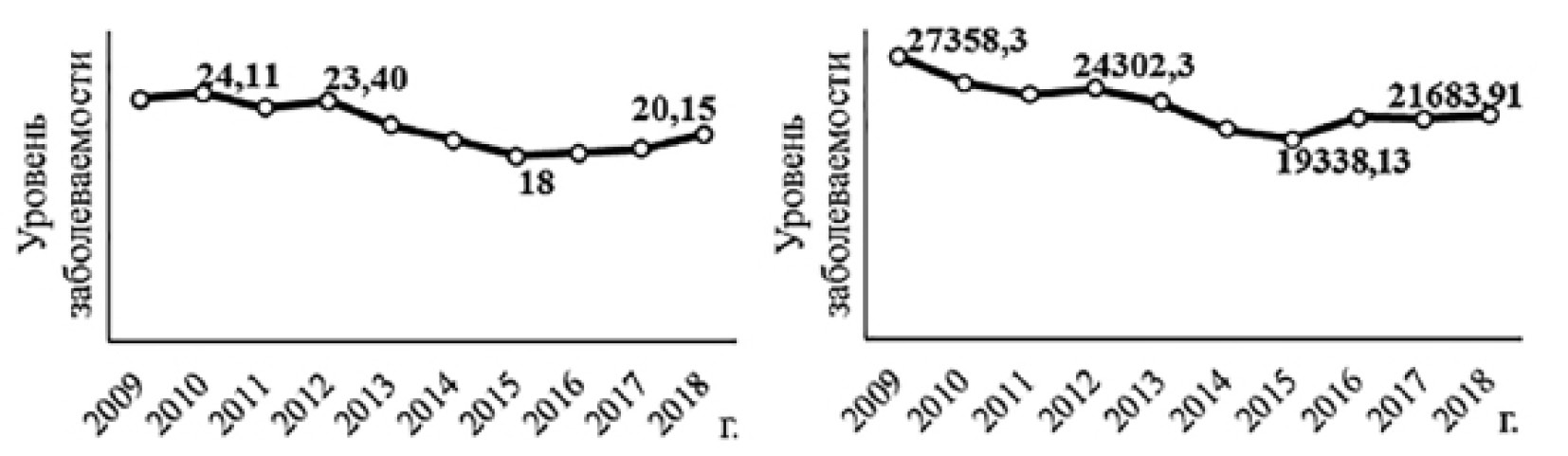 В Российской Федерации с 1990 по 2018 г. отмечен рост заболеваемости инфекционным мононуклеозом. При этом в отдельных субъектах тенденции изменения показателей не совпадали с таковыми в целом по стране. Например, средние многолетние уровни заболеваемости в Москве практически не отличались от средних по стране [15], но в 2010–2016 гг. на фоне непрерывного роста заболеваемости в Российской Федерации в столице было отмечено ее снижение [11].