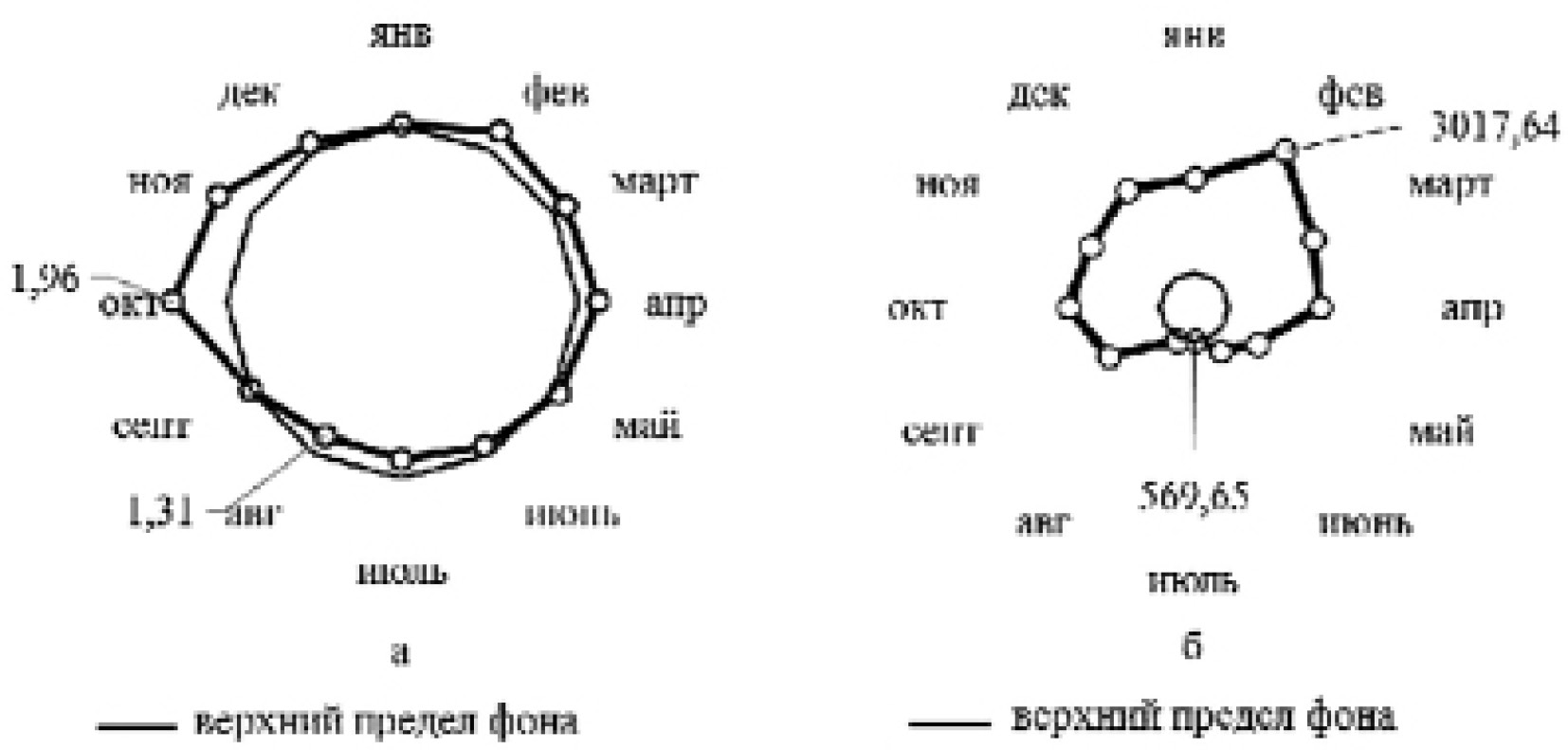 Несмотря на общее сходство времени формирования сезонного подъема, каждая из изучаемых нозологий имела свои особенности. Для инфекций верхних дыхательных путей зарегистрирован более интенсивный рост заболеваемости в холодный период года с максимумом в феврале. Средний многолетний уровень заболеваемости в этом месяце превысил верхний предел фонового значения в 5,3 раза. Пик заболеваемости инфекционным мононуклеозом пришелся на октябрь, при этом показатель превысил верхний предел фона всего в 1,31 раза.