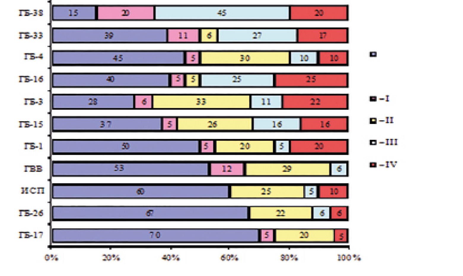 Результаты и их обсуждение. При исследовании общих параметров оценки КМП больным ОЖКК в МО СПб выявлено, что почти в 55% наблюдений у больных ОЖКК, госпитализированных в МО СПб, отмечаются погрешности в оказании МП (рис. 1). Констатируемые дефекты МП как по своим характеристикам, так и по частоте встречаемости, оказывались неоднозначными. В 4 стационарах (ГБ-17, ГБ-26, ИСП, ГВВ) удельный вес случаев оказания МП надлежащего качества превышал 50%. Частота встречаемости случаев с негативными последствиями дефектов предоставления МП для состояния пациентов, страдающих ОЖКК, достигала 28%, превысив 50% в ГБ-38. Показатели случаев ненадлежащего КМП с реальным негативным влиянием на состояние больных (IV класс) оказались неустойчивыми, колеблясь от 0% в ГВВ до 25% в ГБ-16. Параметр частоты встречаемости наблюдений ненадлежащего КМП при неоптимальном использовании ресурсов здравоохранения (случаи II класса) составил 20%. В 7% случаев самым значимым следствием дефектов МП оказывались затруднения экспертной оценки процесса ее оказания (случаи I класса ненадлежащего КМП ).