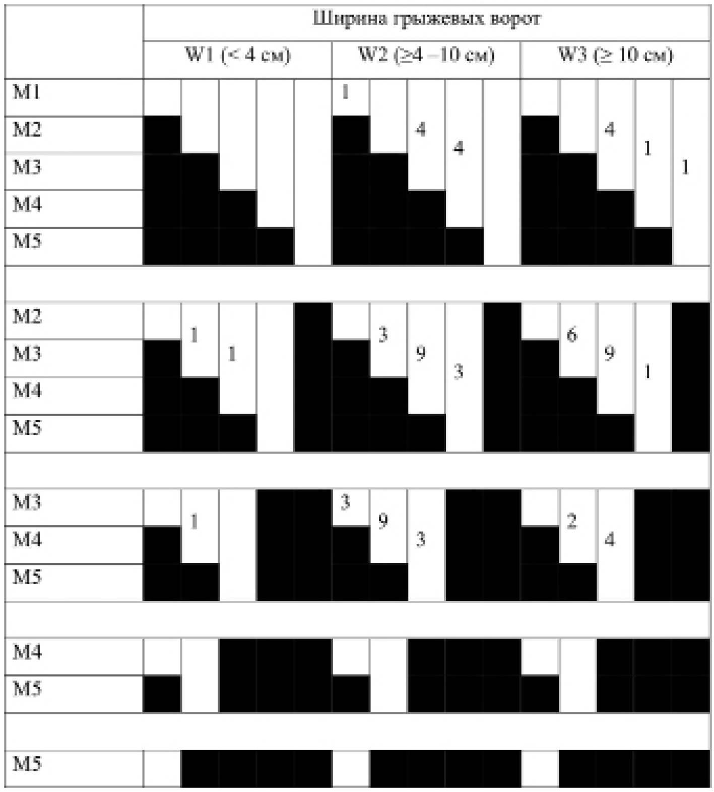 Локализация и размеры ворот вентральных грыж по классификации Европейского общества герниологов (european hernia society – EHS) представлены в таблице.