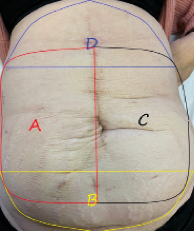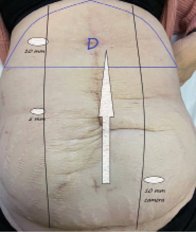 Для понимания эргономики работы в ретромускулярном пространстве предлагаем условно разделять брюшную стенку на 4 сектора (ABCD), рисунок 1. Доступ к разным отделам брюшной стенки удобно проводить в определенной последовательности из соответствующих портов. При этом удается добиться максимально комфортной работы в каждом секторе. Заметим, что каждый сектор не является обособленной анатомической областью, а переходит один в другой.