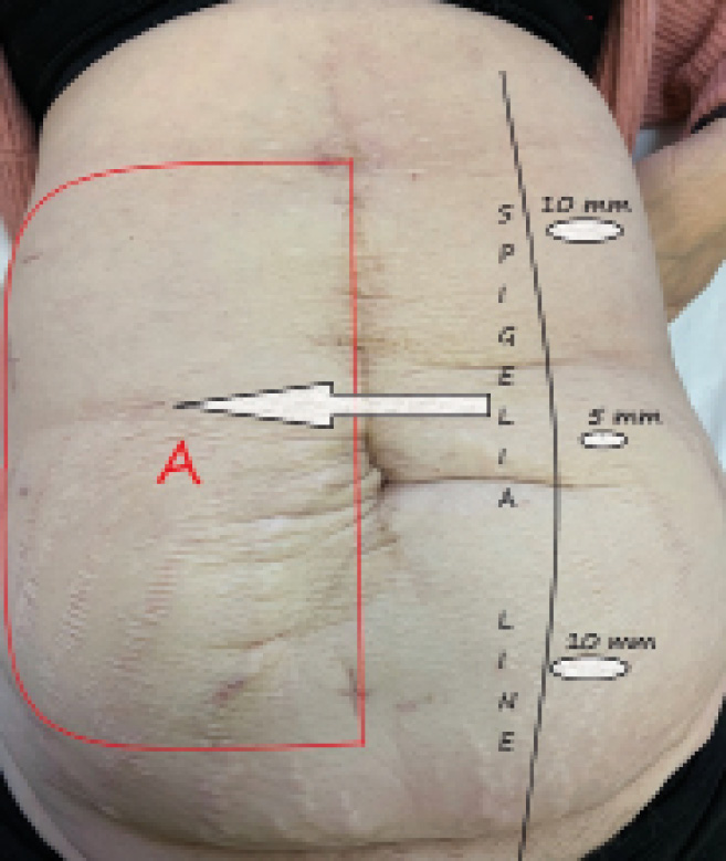Далее осуществляется доступ в ретромускулярное пространство путем вскрытия заднего листка влагалища правой прямой мышцы живота и выполнения TAR с сектора А по сектор D.