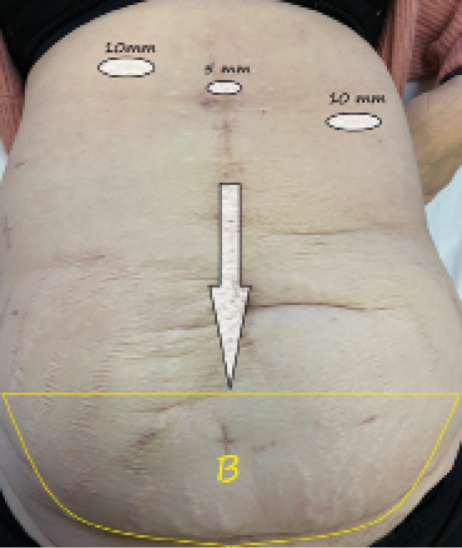 Сектор В охватывает отделы передней брюшной стенки ниже линии, соединяющей SIAS. Этот сектор включает в себя пространства Богро с обеих сторон и пространство Ретциуса. При этом максимально комфортно работать в этом секторе можно из троакаров, установленных в эпигастральной области, в каудальном направлении (рис. 3).