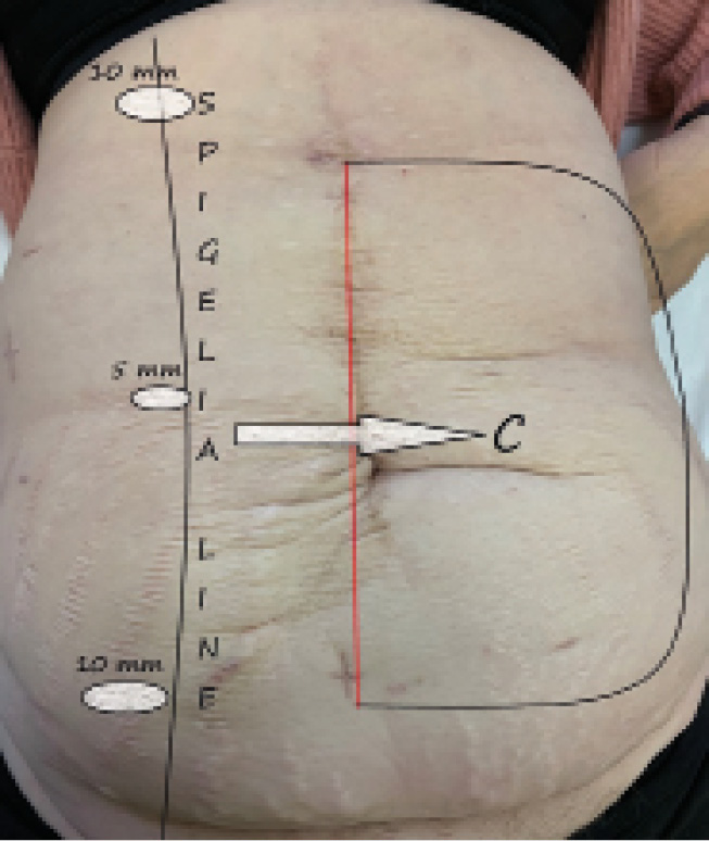 Сектор С является зеркальным отражением сектора А относительно срединной линии. Это сектор прое-цируется позади левой прямой и поперечной мышцы живота. Сверху он ограничен 7 ребром, снизу линией, соединяющей SIAS. Комфортные условия для работы в этом секторе достигаются при использовании доступов, расположенных на 1–2 см латеральнее правой спигелиевой линии (рис. 4).