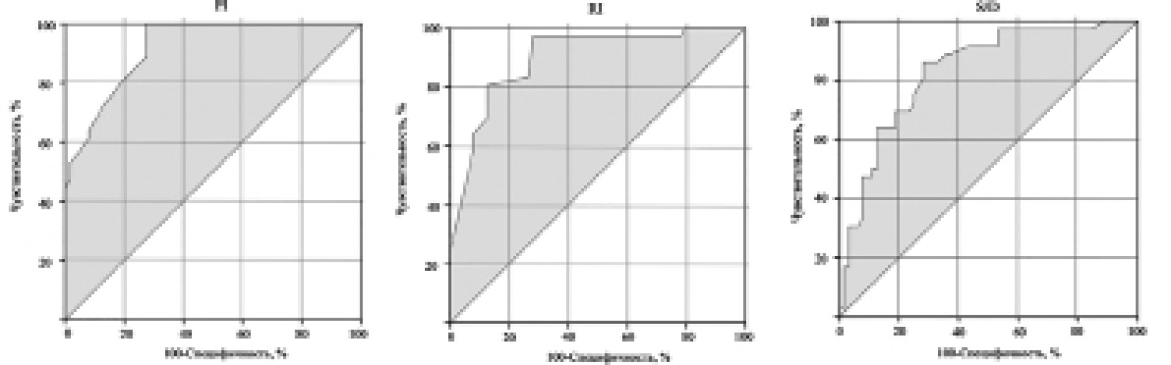 Рис. Определение пороговых значений RI, PI, S/D, свидетельствующих о наличии признаков ХБП у больных СД 2-го типа