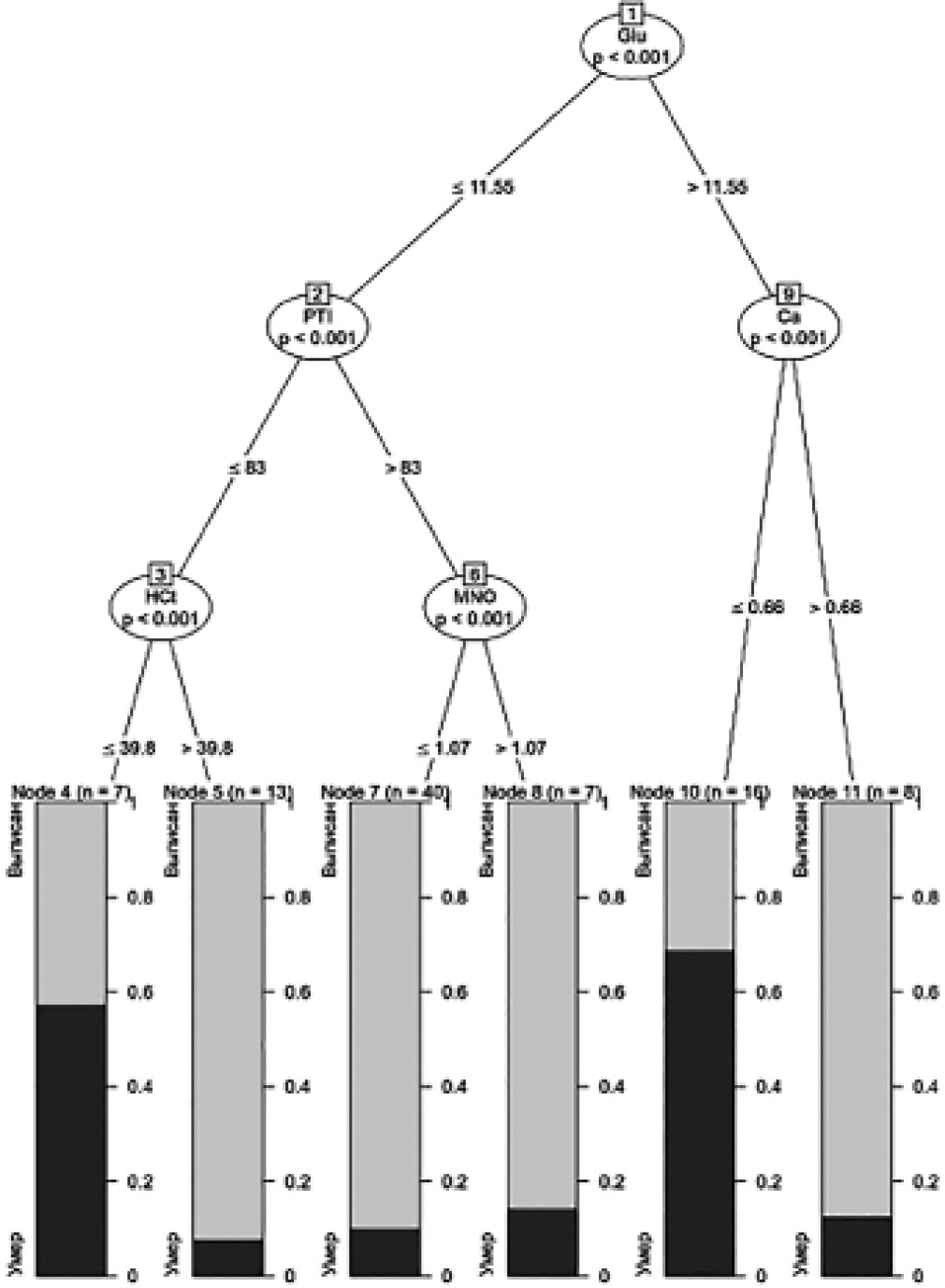 На основе применения алгоритма CART для получения пороговых значений лабораторных параметров, влияющих на исход заболевания, и выявления их сочетаний построено дерево решений – модель прогноза исхода заболевания у конкретного больного (рис. 2).
