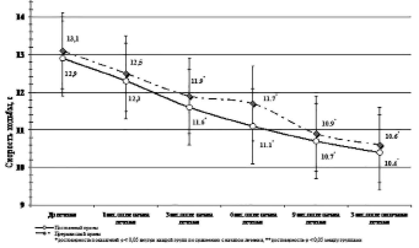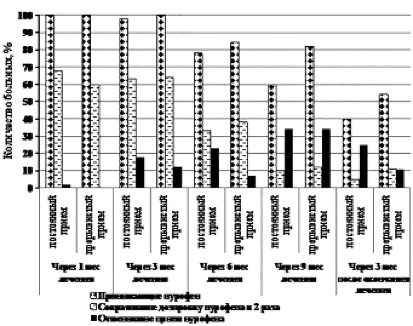Рис. 2. Динамика функциональной недостаточности при постоянном и прерывистом приеме препарата