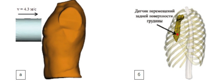 Рис. 3. Фронтальный удар импактора в грудную клетку: а – направление и область воздействия импактора; б – место расположения датчика перемещений