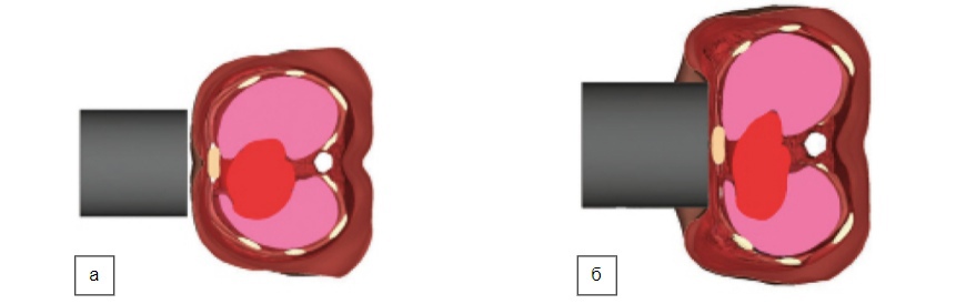 Рис. 5. Положение грудной клетки при воздействии импактора (вид в поперечном сечении): а – до воздействия импактора; б – через 0,02 с после воздействия импактора