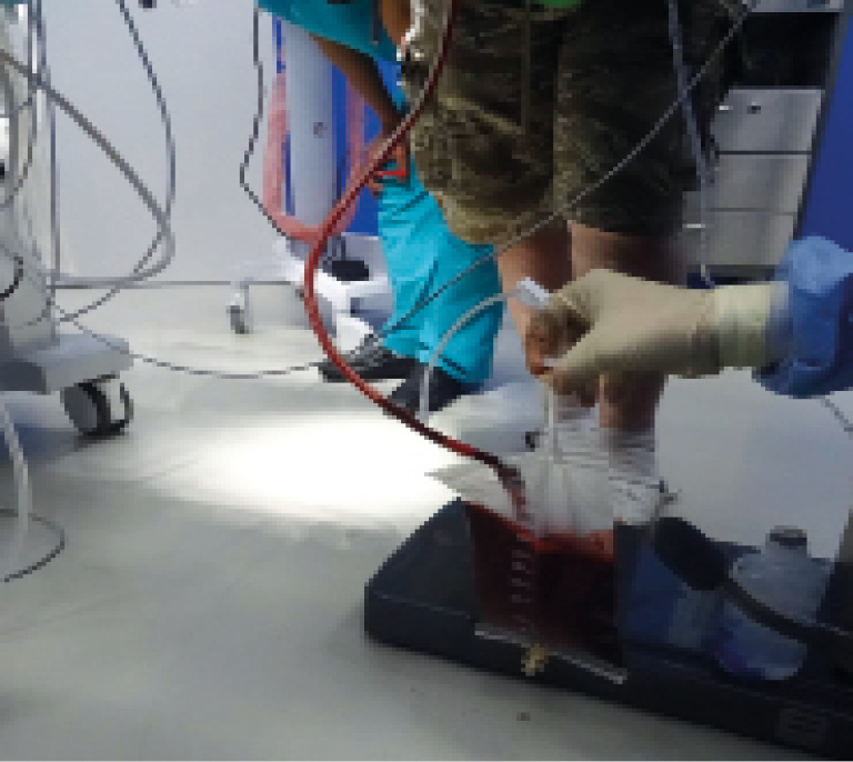 Контейнер с собранной кровью подключался к системе для внутривенных инфузий, реинфузия проводилась в бедренную вену (рис. 9).