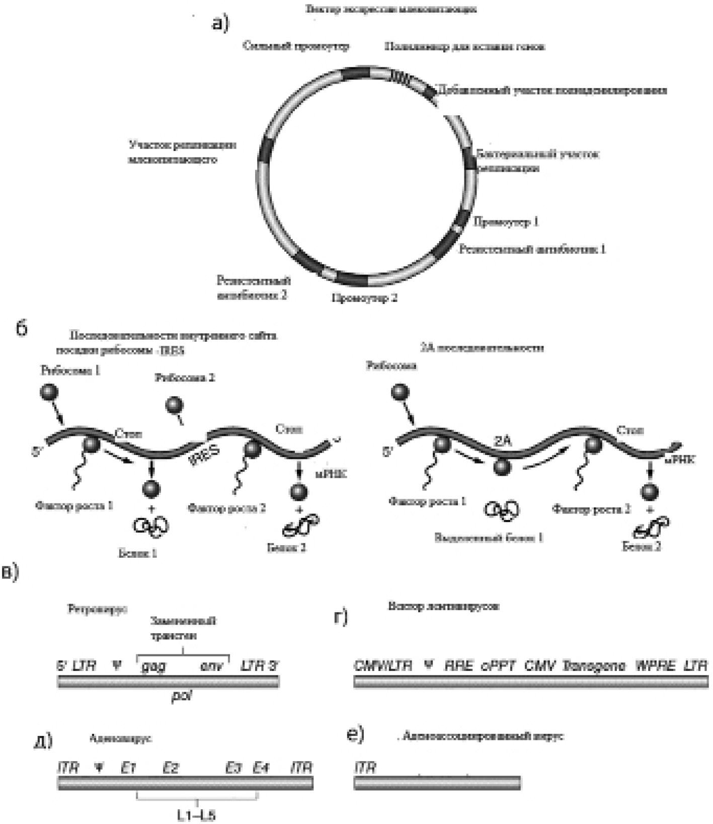 Рис. 1. Схема строения бицистронных векторов на ВСПР и 2А- последовательностей: а – экспрессия плазмид млекопитающих; б – внутренний участок посадки рибосом и 2А-последовательности; в – геном ретровируса. LTR – long terminal repeat (длинные концевые повторы). В векторе гены gag (капсидный белок), pol (обратная транскриптаза) и env оболочечный белок) заменяются интересующим геном; г – вектор лентивирусов. RRE – Rep response element (элемент ответа), cPPT – polypurine region (область полипурина), CMV – promoter for gene of interest (промотер гена «интереса»), WPRE – enhancer sequence (усиливающие последовательности); д – ITR – inverted terminal repeat (инвертированные терминальные повторы), E1–4 are early expressed genes (ранняя экспрессия генов, L1–5 are late genes (поздняя экспрессия генов). В векторе первого поколения ген E1, необходимый для репликации, заменяется вставкой; е – геном AAV. Повтор ITR. Два гена вектора заменяются геном «интереса»