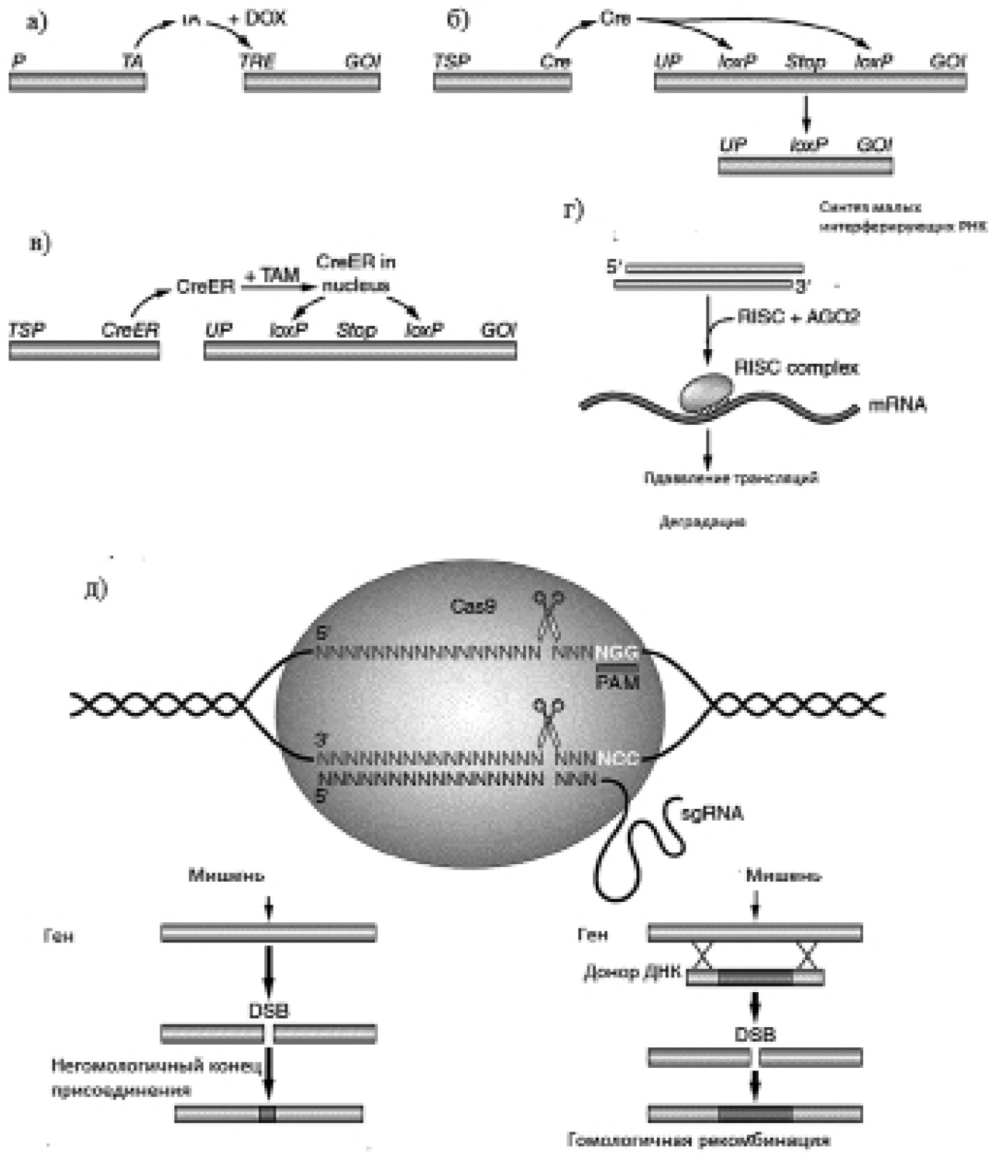Рис. 2. Варианты транскрипции: а – P – промоутер; TA – тетрациклиновый активатор; DOX – доксициклин; ТRЕ – элемент реакции Тет; GOI – ген «интереса»; б – TSP – тканевый промоутер; UP – убиквитарный промоутер; в – ТАМ – тамоксифен; г – RISC РНК индуцированный подавляющий комплекс; AGO2 – Argonaute 2 (эндонуклеаза, белковый комплекс); д – CRISPR-Cas9. PAM – смежный мотив протосканера, sgRNA – одноцепочечная РНК, DSB – двухцепочечный разрыв; Non-homologous end joining (NHEJ) – негомологичный конец присоединения; homologous recombination (HR) – гомологичная рекомбинация