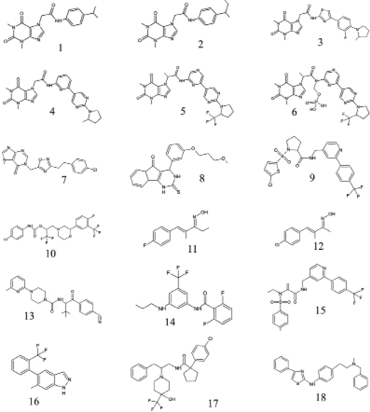 К природным антагонистам человеческого TRPА1 относятся камфара (камфорный лавр, базилик, полынь, розмарин), 1,8-цинеол (кардамон, эвкалипт лимонный, шалфей, мята и др.), борнеол (борнейский лавр), кардамонин (Alpinia katsumadai hayata семейства Имбирные), однако все они не обладают достаточно мощным ингибирующим эффектом [34]. В связи с недостатком эффективных селективных природных ингибиторов TRPА1 с подходящими для создания лекарственных препаратов свойствами область поиска антагонистов была сужена до синтетических молекул, которых в настоящее время насчитывается около сотни. Структурные формулы наиболее изученных из них представлены на рисунке.