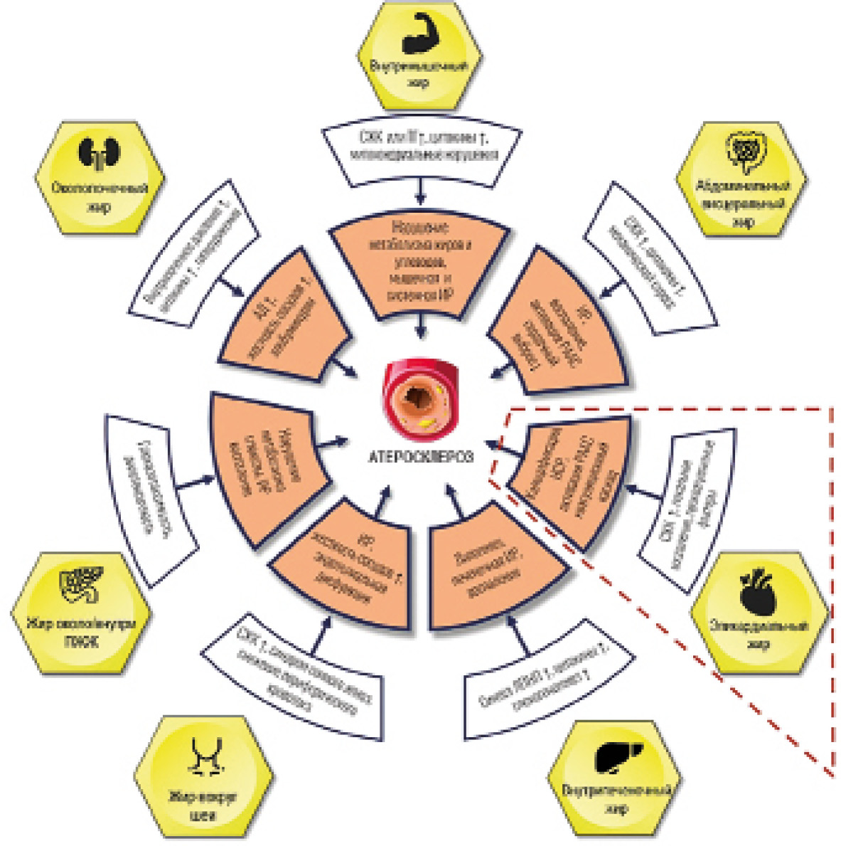 Изучение многообразия патогенетических механизмов повышения сердечно-сосудистого риска за счет суммации влияния эффектов жирового депо на атерогенез является перспективным направлением профилактической кардиологии. Не последнюю роль в механизме патогенетического каскада играет эпикардиальная жировая ткань (рисунок) [18].