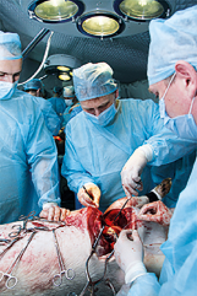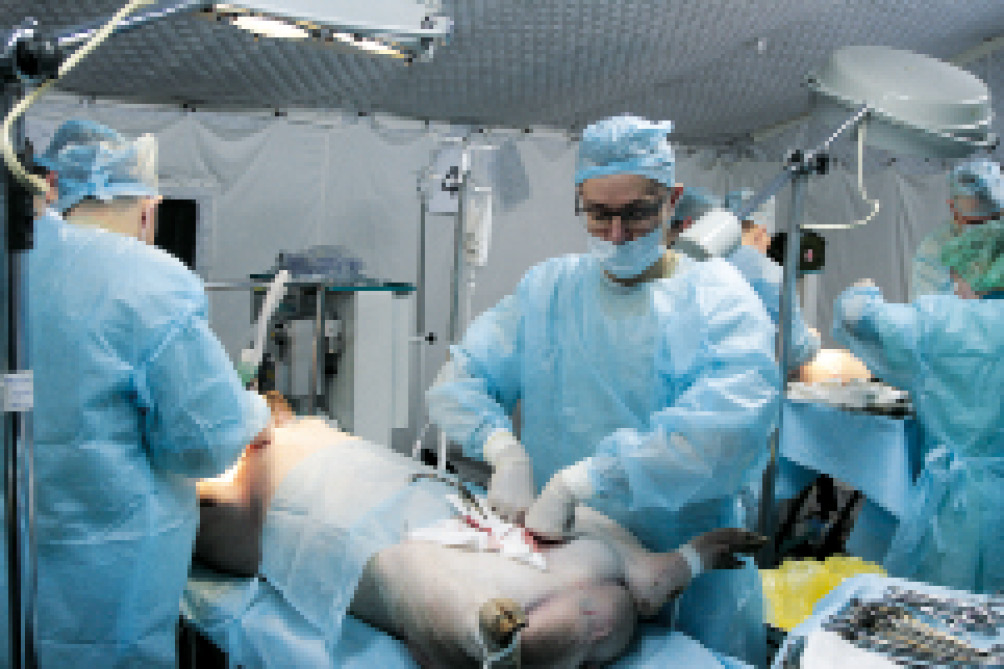Важным практическим разделом обучения явились занятия с хирургами войскового и госпитального звеньев, санитарными инструкторами на живых биологических объектах (свиньях массой 45–50 кг). Отрабатывались навыки по временной (в том числе с санитарными инструкторами) и окончательной остановке артериального и венозного кровотечения, временному протезированию поврежденных артерий, коникотомии, инфузионному костному доступу, лапаротомии, маневрам висцеральной ротации с целью доступа к крупным сосудам забрюшинного пространства, по ушиванию раны нижней полой вены, ревизии и наложению шва при ранах полых и паренхиматозных органов брюшной полости, по применению маневра Прингля, временному гемостазу при внутрибрюшных кровотечениях, торакотомии, ушиванию раны сердца, атипичной резекции легкого и др. (рис. 2–3).