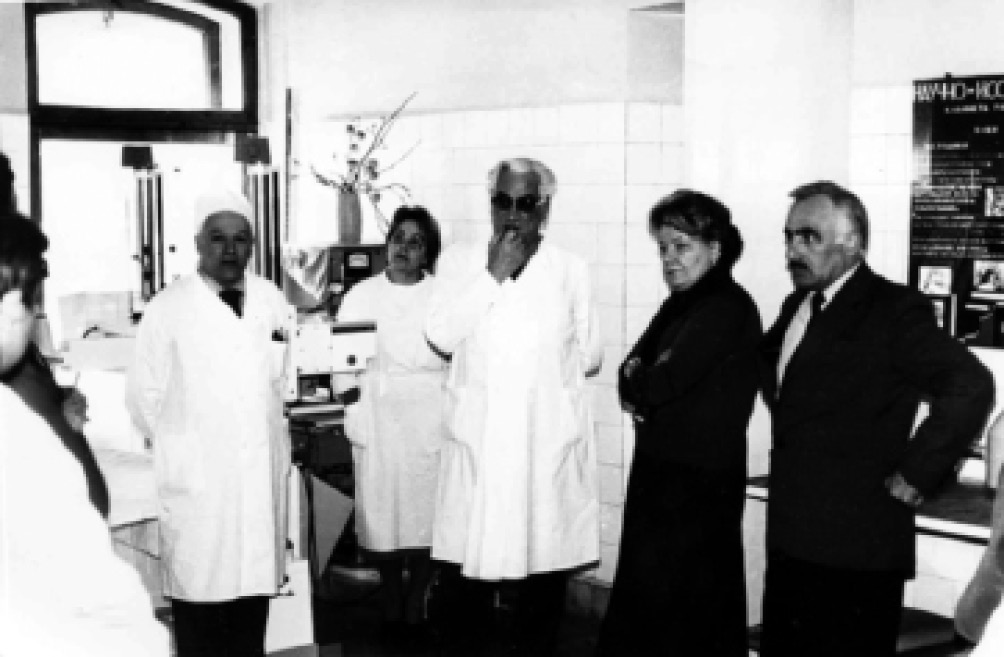 Рис. 4. Начальник кафедры ВПХ профессор И.И. Дерябин во время посещения зарубежными специалистами радионуклидного кабинета клиники (слева – заведующий кабинетом кандидат медицинских наук И.Н. Липилкина и старший научный сотрудник НИЛ доктор медицинских наук Э.В. Пашковский)