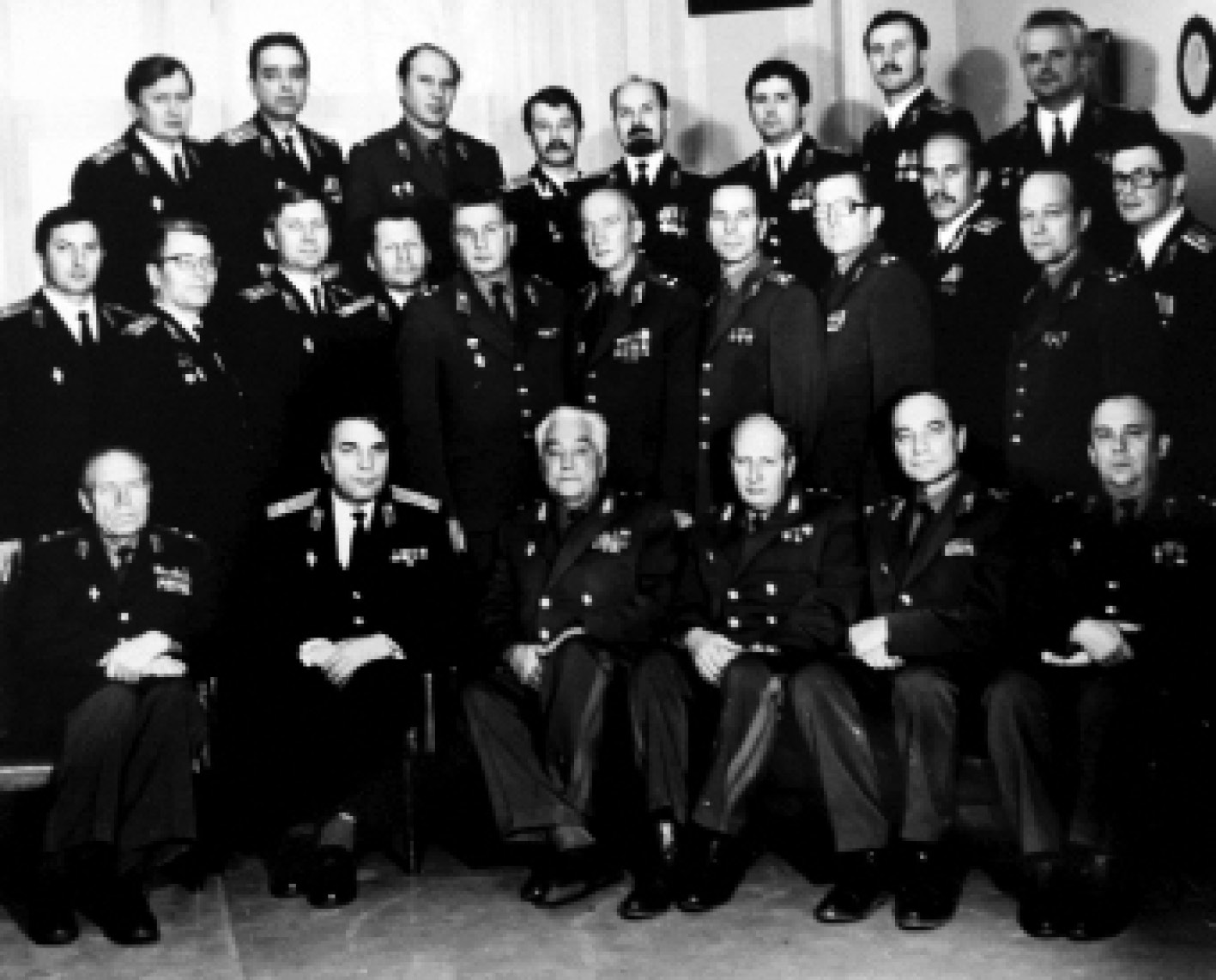 Рис. 9. Профессора А.Н. Беркутов, И.И. Дерябин и О.С. Насонкин с членами кружка военно-научного общества курсантов и слушателей (ВНОКС) кафедры ВПХ