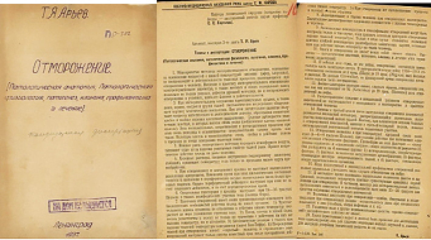 Спустя всего два года с даты поступления в адъюнктуру в 1937 г. и за год до защиты диссертации из печати выходит монография: «Отморожение: патологическая анатомия, патологическая физиология, патогенез, клиника, профилактика и лечение» [1]. В последующем каждые два года (и даже в тяжелейшее время Великой Отечественной войны (1942 г.)) труд будет переиздаваться. В ней автор обобщил результаты проведенной работы по теме исследования. Это, безусловно, способствовало тому, что в 1938 г. Т.Я. Арьев успешно защитил кандидатскую диссертацию. В настоящее время ее рукопись и тезисы к ней (рис.) находятся на хранении в фондах фундаментальной библиотеки ВМА. С высокой степенью уверенности можно предположить, что это единственный экземпляр, оставшийся для работы в открытом доступе на территории бывшего СССР5.