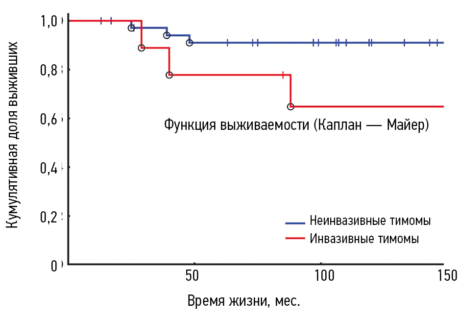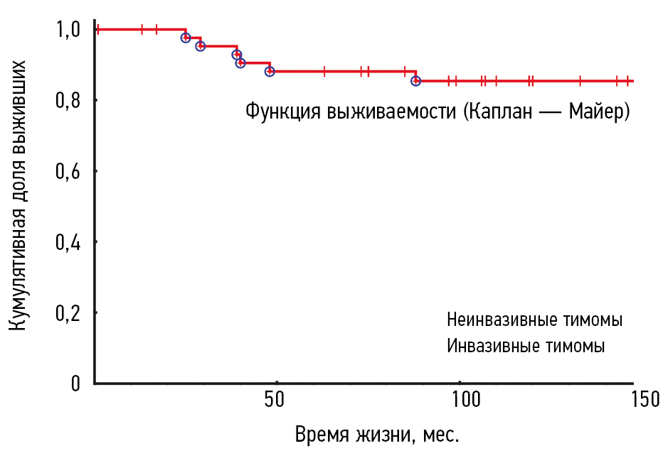 Из рисунка 2 видно, что сроки дожития значимо больше в группе пациентов, страдающих неинвазивными тимомами (при I–II стадии прогрессии по классификации Masaoka — Koga или I–II стадии по классификации TNM) по сравнению с пациентами, страдающими инвазивными тимомами. Годичная, 3-, 5- и 10-летняя кумулятивная выживаемость составила 100; 94,2 ± 3; 91,1 ± 4; 91,1 ± 4 и 100; 77,8 ± 4; 77,8 ± 4; 65,8 ± 5 % соответственно (р = 0,021).