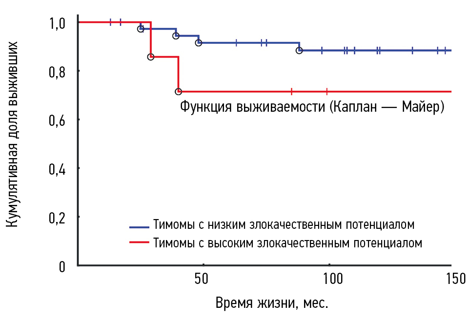 Сравнивая общую выживаемость между группами пациентов с низким (А, АВ, В1 типы) и высоким (В2, В3, С) злокачественным потенциалом тимом (см. рис. 3) установлено, что сроки дожития значимо больше в группе с низким злокачественным потенциалом тимом. Показатели 1-, 3-, 5- и 10-летней выживаемости для них составили 100; 94,5 ± 4; 91,6 ± 4; 88,5 ± 5 и 100; 71,4 ± 5; 71,4 ± 5; 71,4 ± 5 % соответственно (р = 0,025).