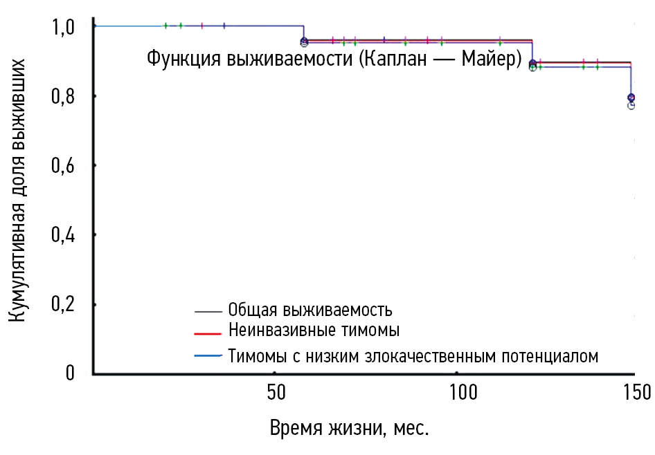 В группе больных, прооперированных эндовидеохирургически, в послеоперационном периоде 1 (4,5 %) пациент нуждался в проведении адъювантной лучевой терапии. Рецидивов тимомы в данной группе не зафиксировано. Показатели кумулятивной годичной, 3-, 5- и 10-летней выживаемости составили 100; 100; 96 ± 4 и 90 ± 7 % соответственно. В целом по группе долгосрочная выживаемость среди пациентов, страдающих неинвазивными тимомами и тимомами с низким злокачественным потенциалом, не отличалась от общей кумулятивной выживаемости (р = 0,6 и 0,18).