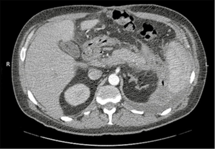 Figure: 1. Computed tomography of the abdomen with bolus contrast . Nonspecific CT scans of traumatic pancreatitis: edema of the pancreatic parenchyma, infiltration of parapancreatic tissue, accumulation of fluid in the cavity of the omental bursa