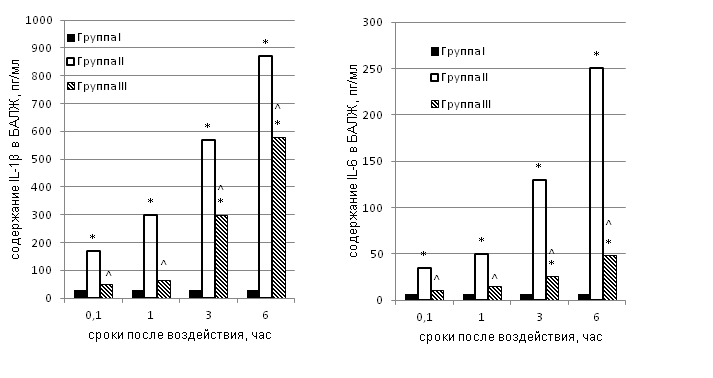 Fig. 2. Dynamics of IL-1β (a) and IL-6 (b) content in the bronchoalveolar lavage fluid of laboratory animals at different times after Cl2 and HCl intoxication (1,5 LC50, 30 min): * — differences compared to group I; ^ — differences between groups II and II (p < 0.05); in each group, n = 6